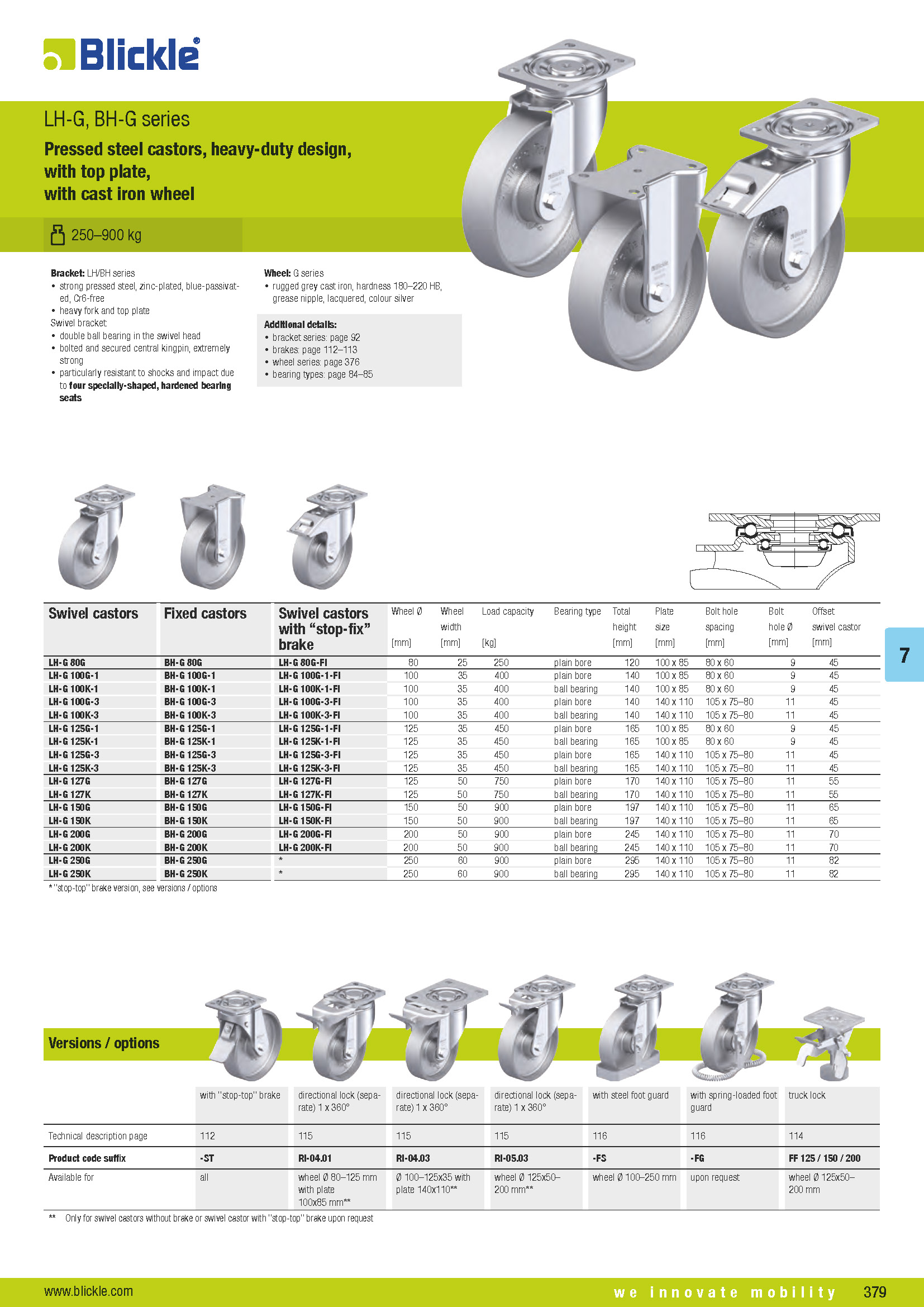LH-G, BH-G Pressed steel castors, heavy-duty design, with top plate, with cast iron wheel
