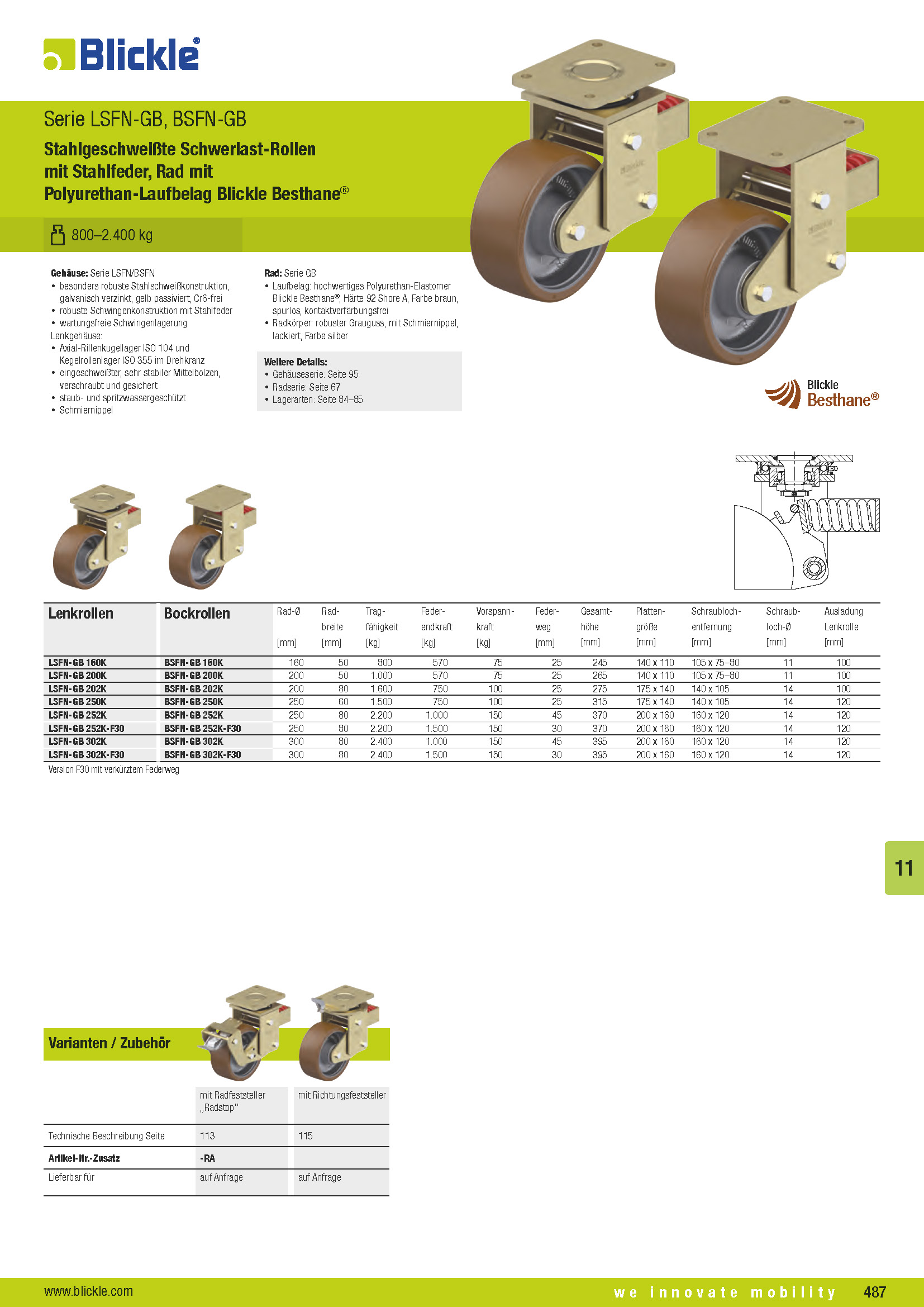 LSFN-GB, BSFN-GB Stahlgeschweißte Schwerlast-Rollen mit Stahlfeder, Rad mit Polyurethan-Laufbelag Blickle Besthane®