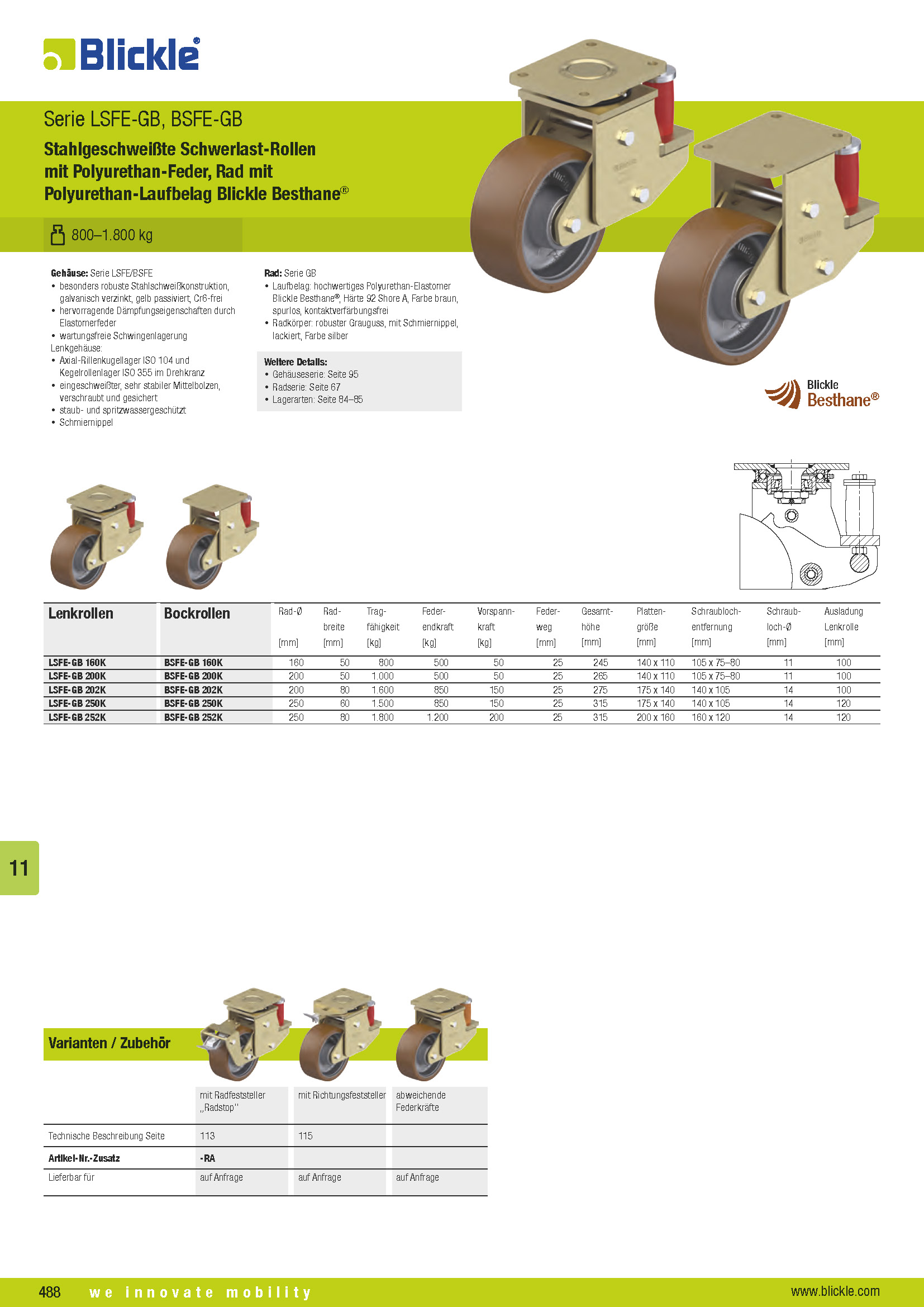LSFE-GB, BSFE-GB Stahlgeschweißte Schwerlast-Rollen mit Polyurethan-Feder, Rad mit Polyurethan-Laufbelag Blickle Besthane®