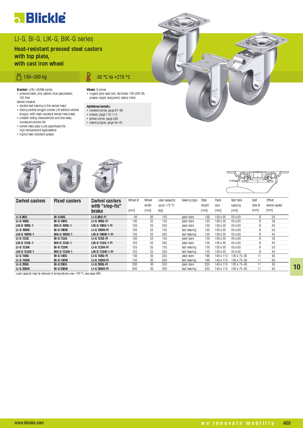 LI-G, BI-G, LIK-G, BIK-G Heat-resistant pressed steel castors with top plate, with cast iron wheel