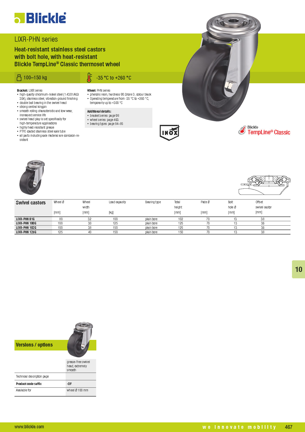 LIXR-PHN Heat-resistant stainless steel castors with bolt hole, with heat-resistant Blickle TempLine® Classic thermoset wheel
