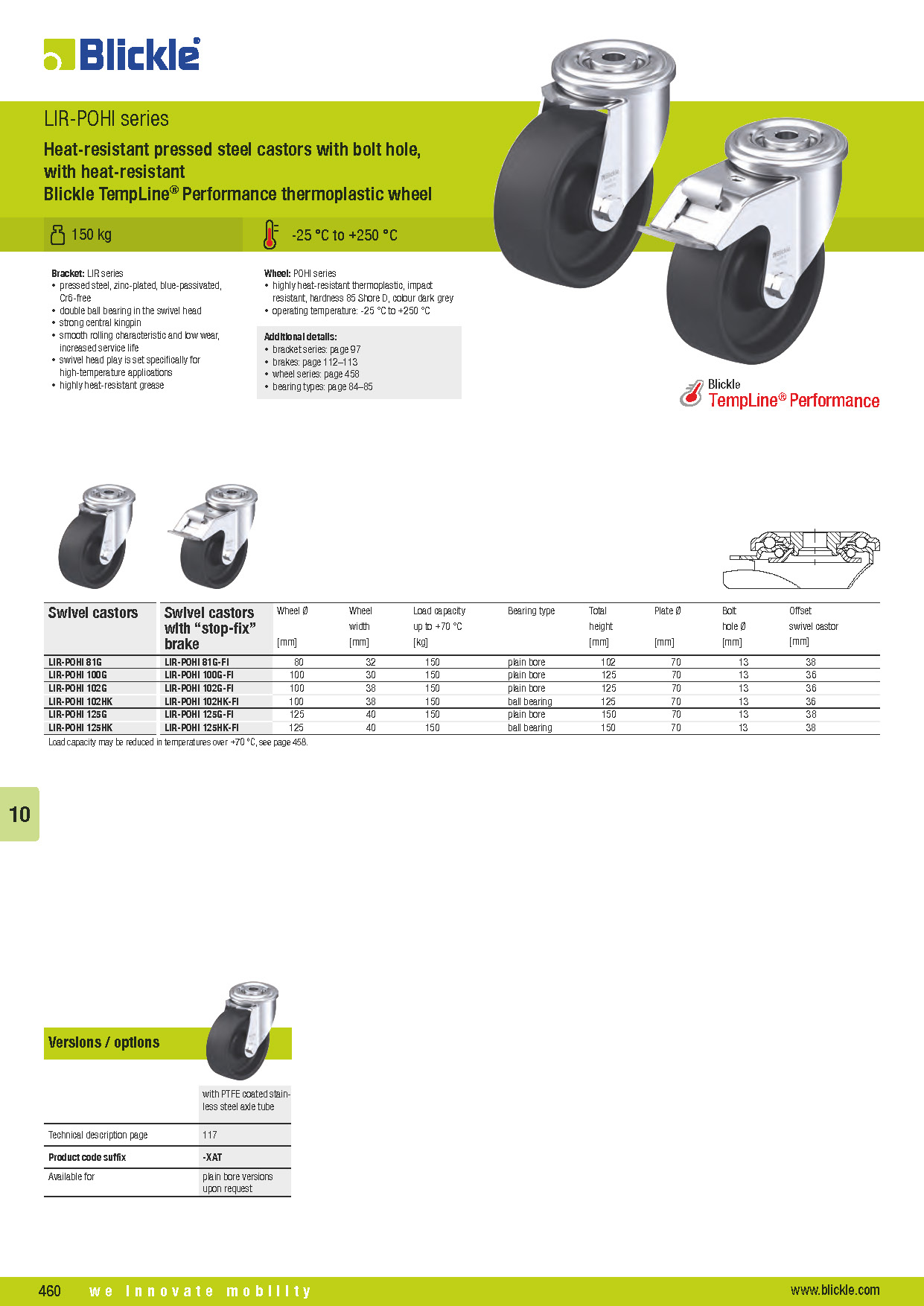 LIR-POHI Heat-resistant pressed steel castors with bolt hole, with heat-resistant Blickle TempLine® Performance thermoplastic wheel