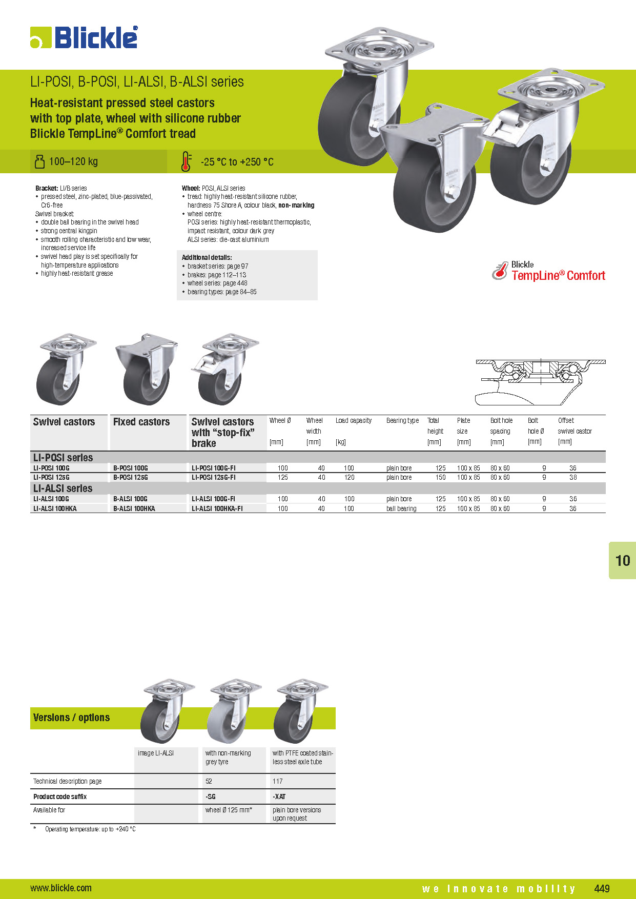 LI-POSI, B-POSI, LI-ALSI, B-ALSI Heat-resistant pressed steel castors with top plate, wheel with silicone rubber Blickle TempLine® Comfort tread