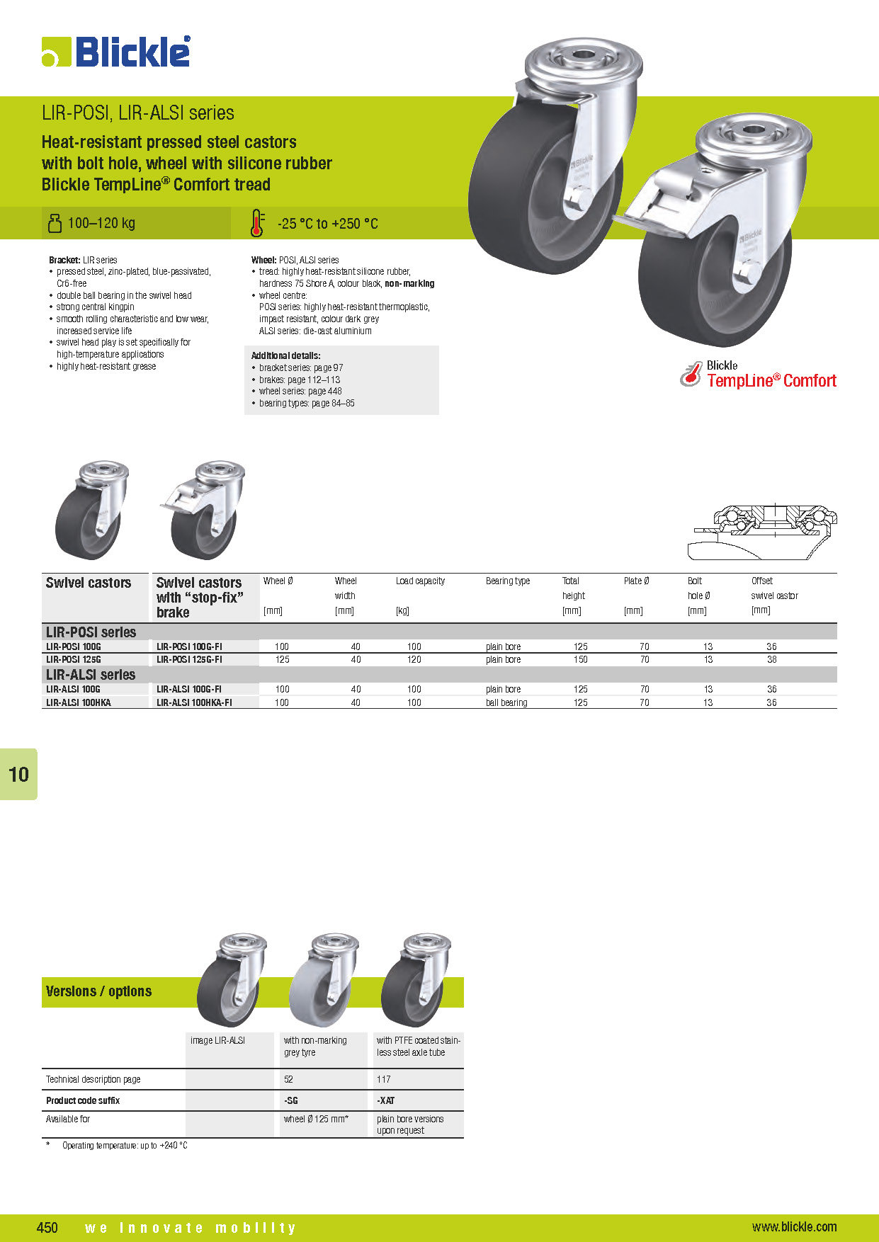 LIR-POSI, LIR-ALSI Heat-resistant pressed steel castors with bolt hole, wheel with silicone rubber Blickle TempLine® Comfort tread
