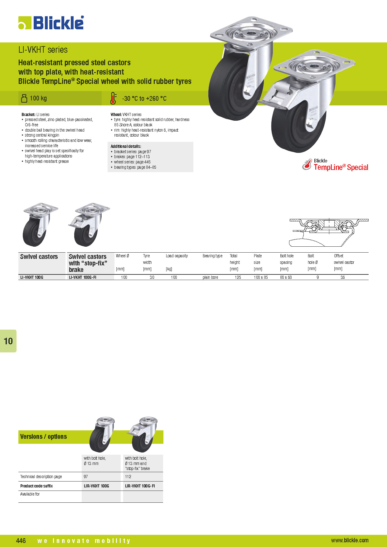 LI-VKHT Heat-resistant pressed steel castors with top plate, with heat-resistant Blickle TempLine® Special wheel with solid rubber tyres