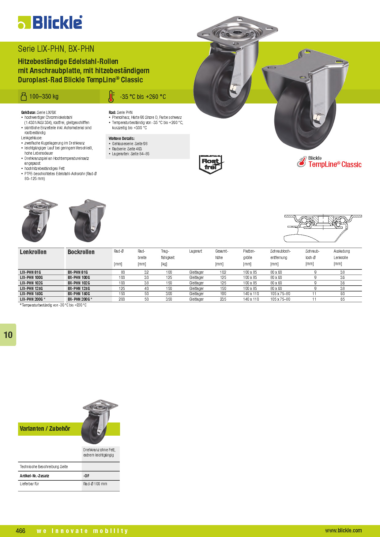 LIX-PHN, BX-PHN Hitzebeständige Edelstahl-Rollen mit Anschraubplatte, mit hitzebeständigem Duroplast-Rad Blickle TempLine® Classic