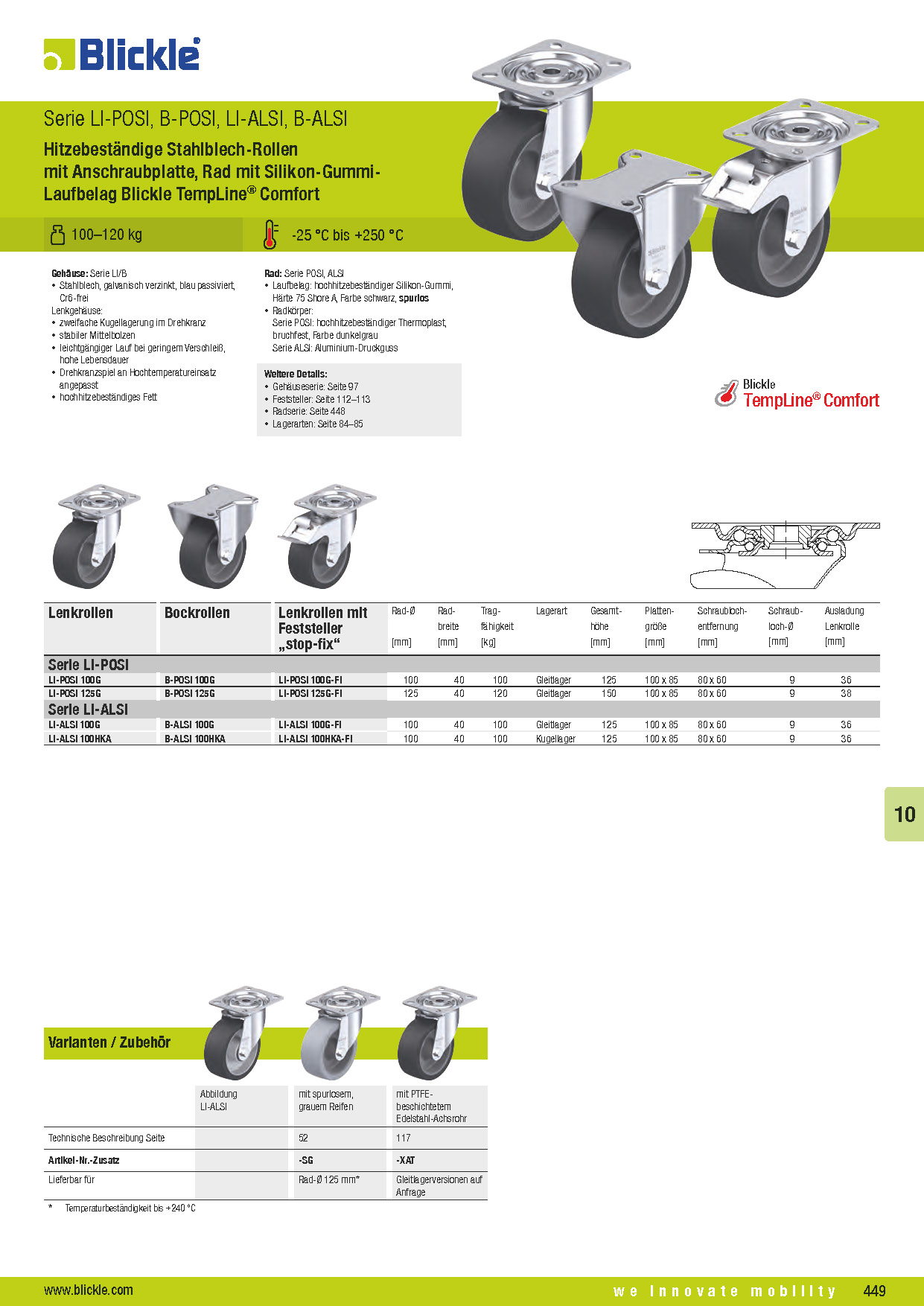LI-POSI, B-POSI, LI-ALSI, B-ALSI Hitzebeständige Stahlblech-Rollen mit Anschraubplatte, Rad mit Silikon-Gummi- Laufbelag Blickle TempLine® Comfort