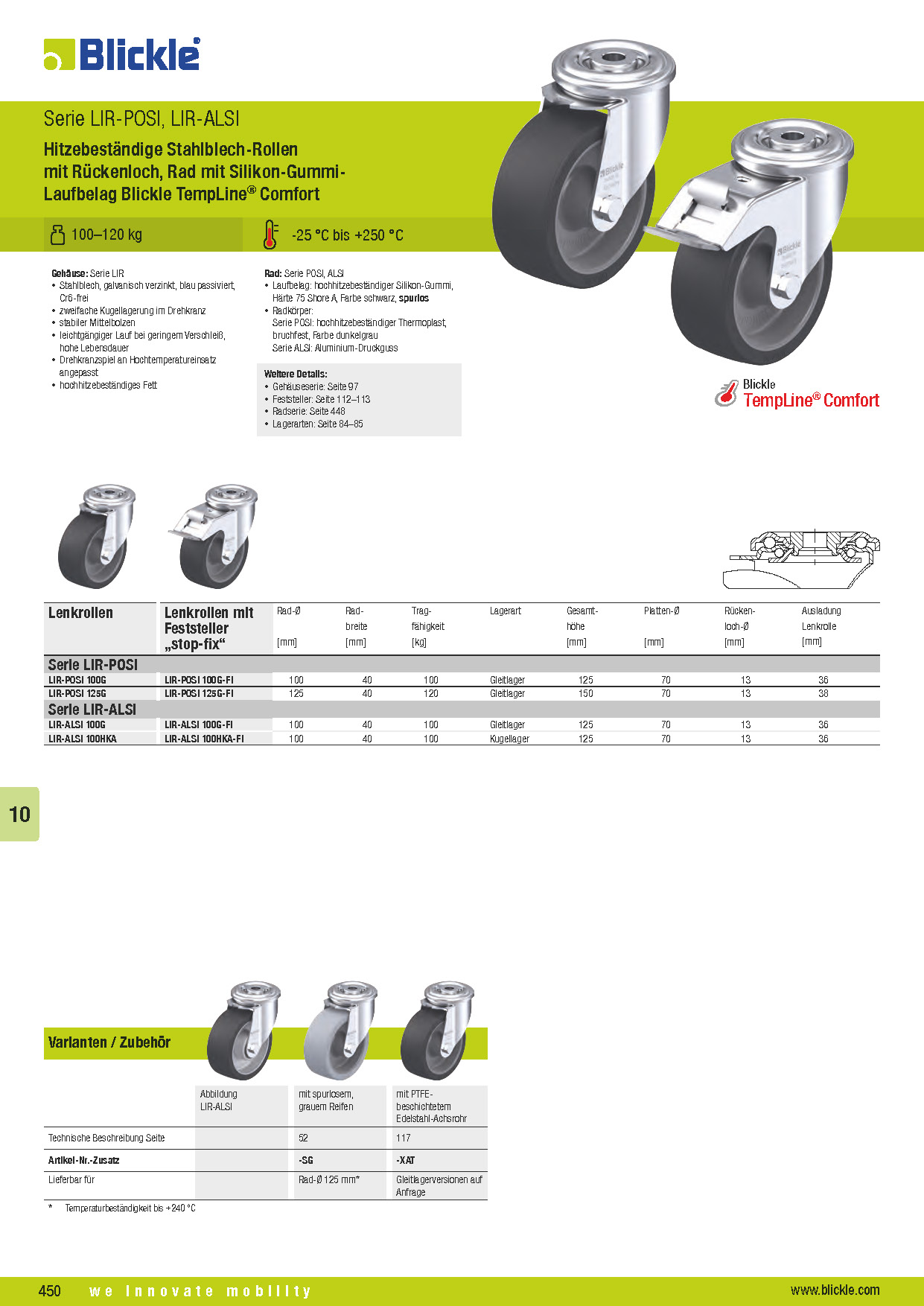 LIR-POSI, LIR-ALSI Hitzebeständige Stahlblech-Rollen mit Rückenloch, Rad mit Silikon-Gummi- Laufbelag Blickle TempLine® Comfort