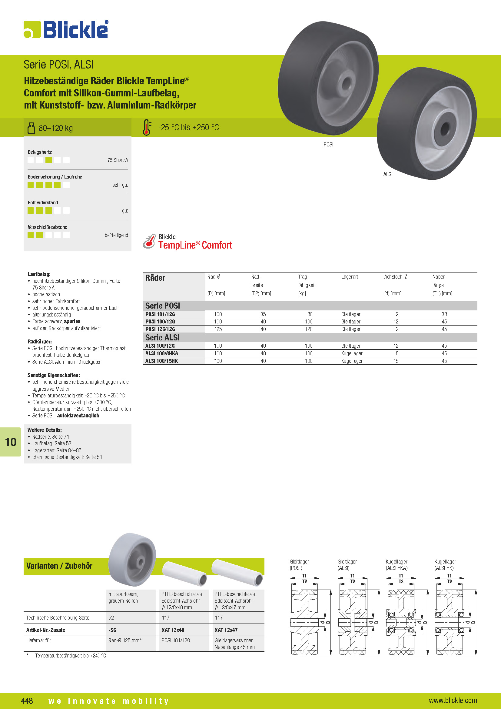 POSI, ALSI Heat-resistant Blickle TempLine® Comfort wheels with silicone rubber tread, with plastic or aluminium wheel centre