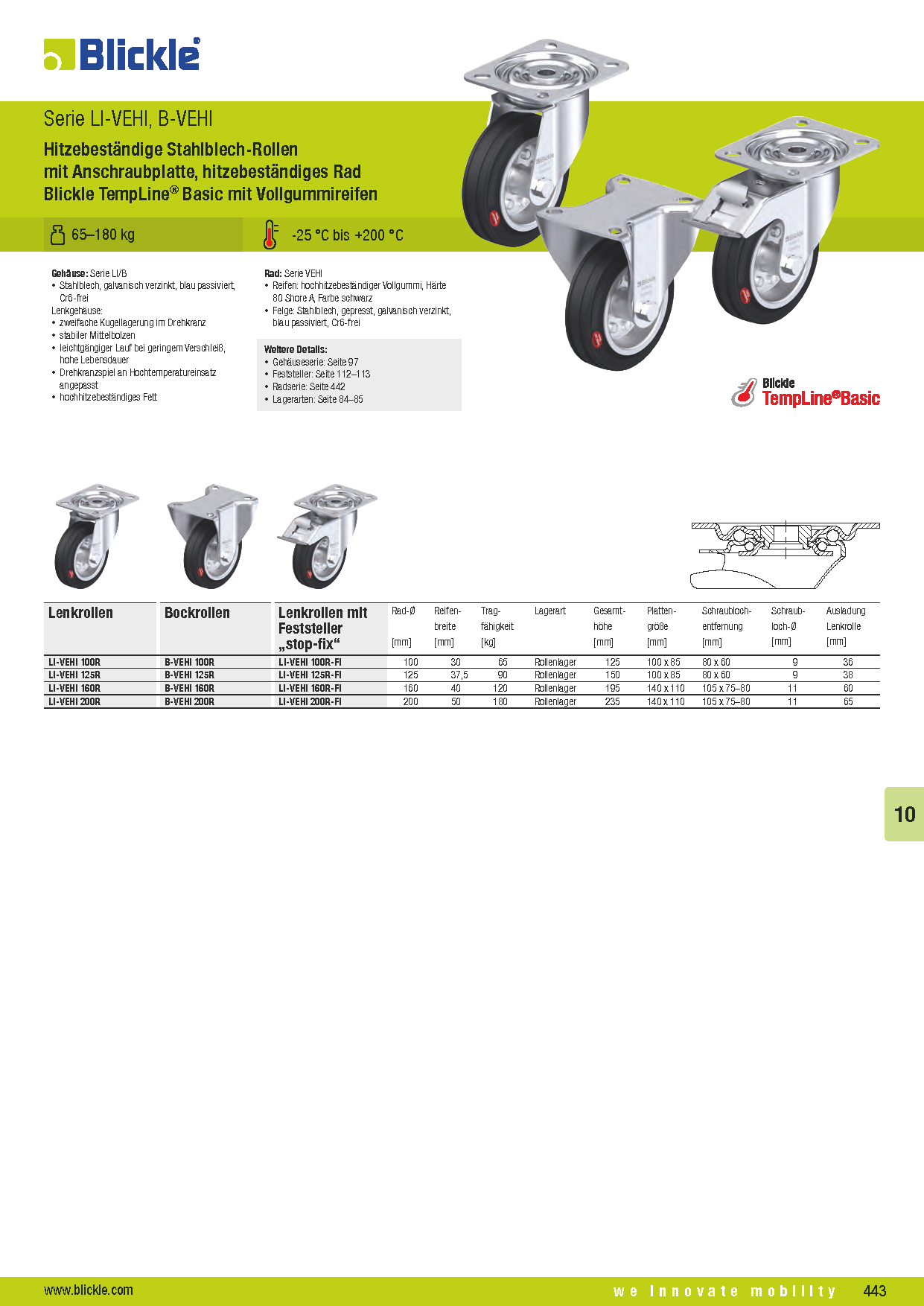 LI-VEHI, B-VEHI Hitzebeständige Stahlblech-Rollen mit Anschraubplatte, hitzebeständiges Rad Blickle TempLine® Basic mit Vollgummireifen