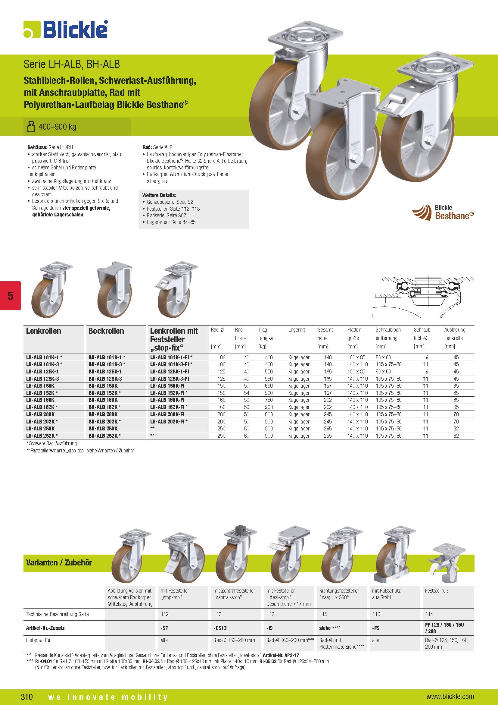 LH-ALB, BH-ALB Stahlblech-Rollen, Schwerlast-Ausführung, mit Anschraubplatte, Rad mit Polyurethan-Laufbelag Blickle Besthane®