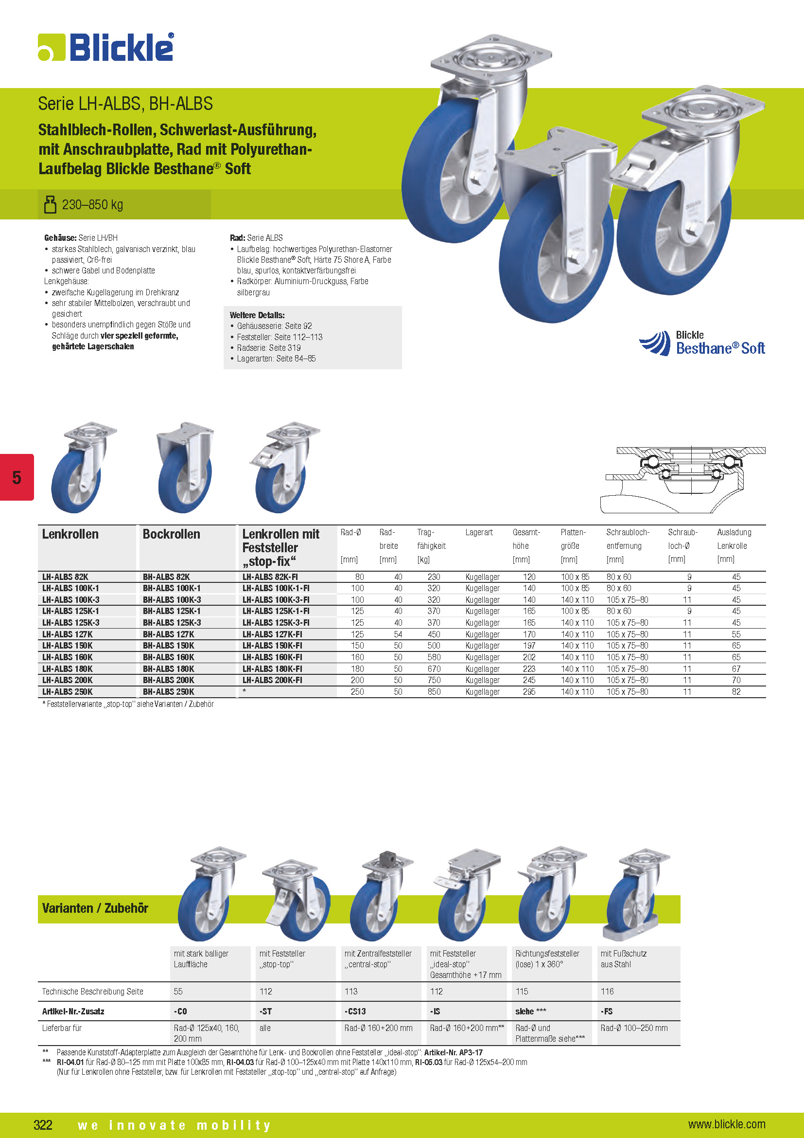 LH-ALBS, BH-ALBS Stahlblech-Rollen, Schwerlast-Ausführung, mit Anschraubplatte, Rad mit Polyurethan- Laufbelag Blickle Besthane® Soft