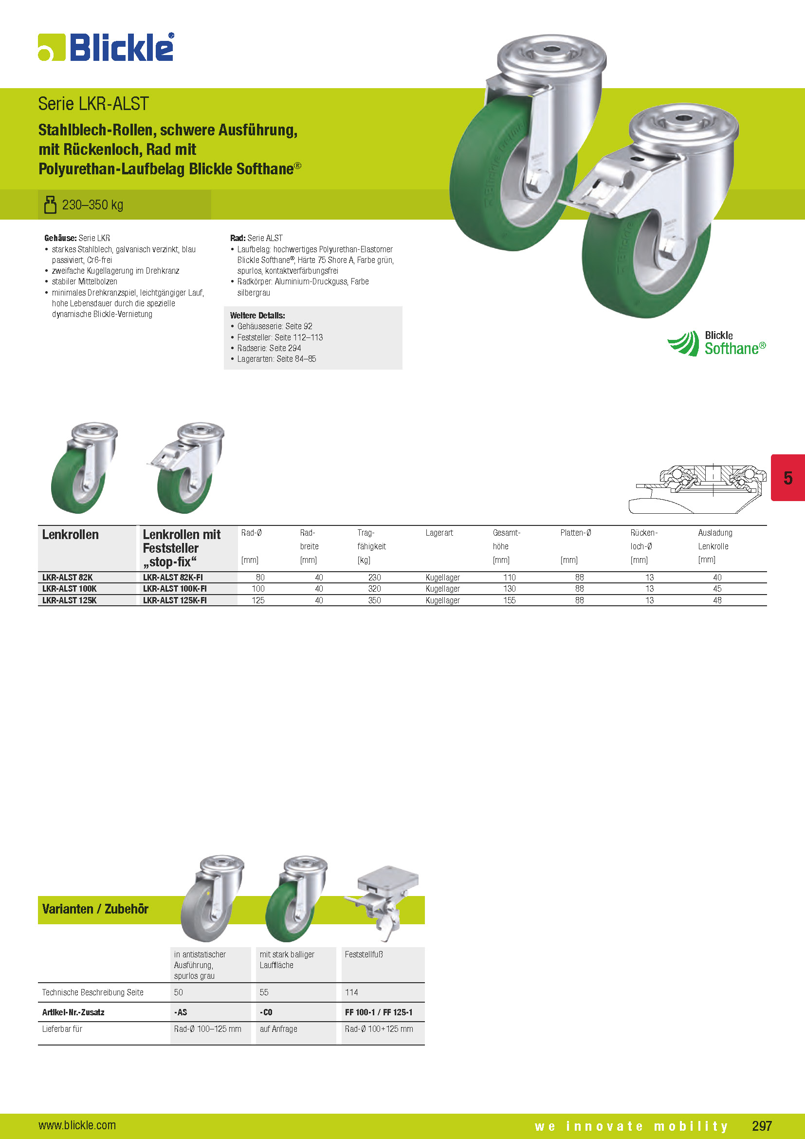 LKR-ALST Stahlblech-Rollen, schwere Ausführung, mit Rückenloch, Rad mit Polyurethan-Laufbelag Blickle Softhane®