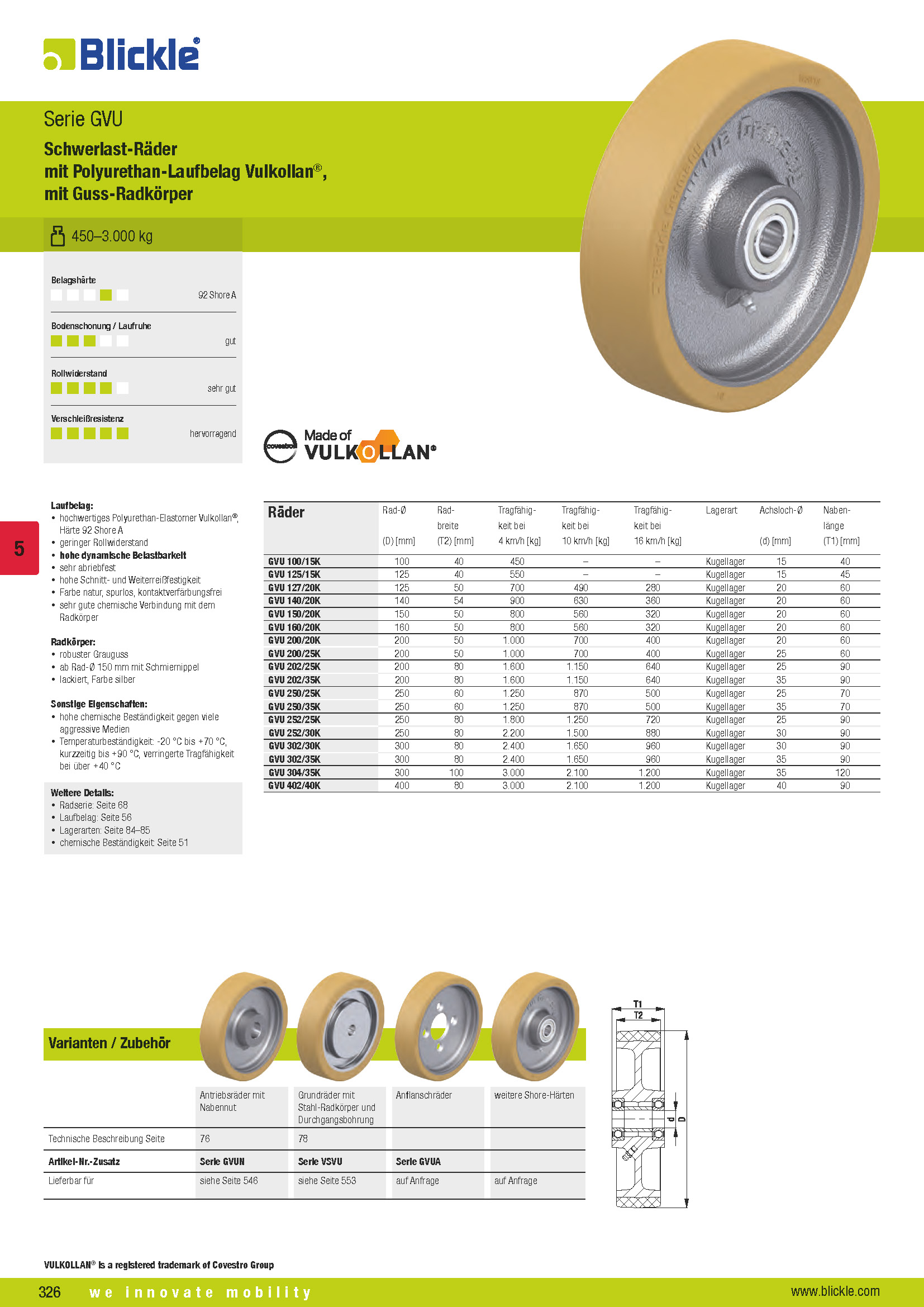 GVU Schwerlast-Räder mit Polyurethan-Laufbelag Vulkollan®, mit Guss-Radkörper