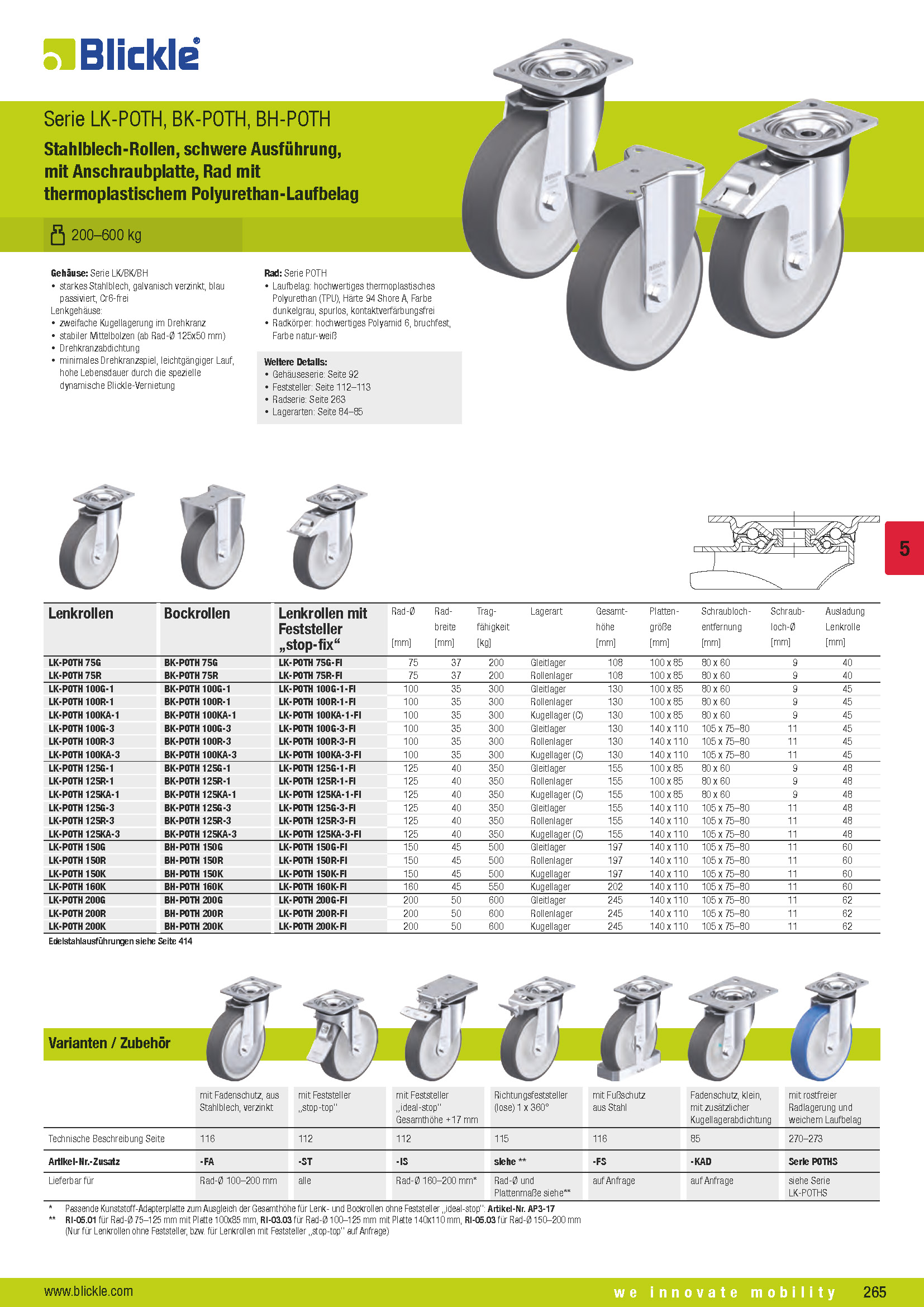 LK-POTH, BK-POTH, BH-POTH Stahlblech-Rollen, schwere Ausführung, mit Anschraubplatte, Rad mit thermoplastischem Polyurethan-Laufbelag