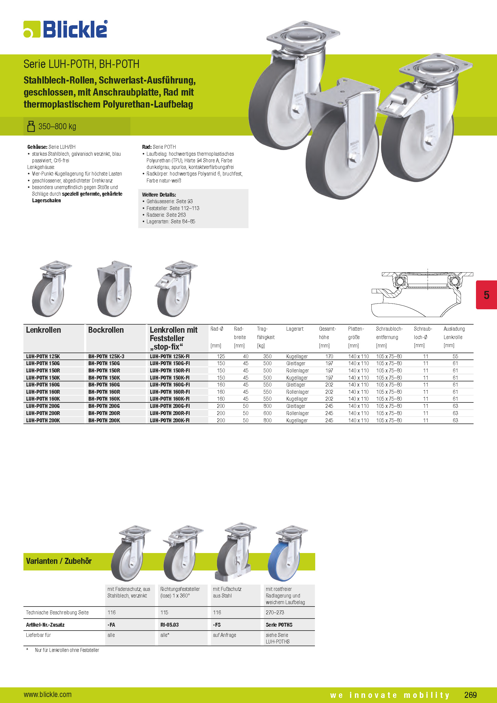 LUH-POTH, BH-POTH Stahlblech-Rollen, Schwerlast-Ausführung, geschlossen, mit Anschraubplatte, Rad mit thermoplastischem Polyurethan-Laufbelag