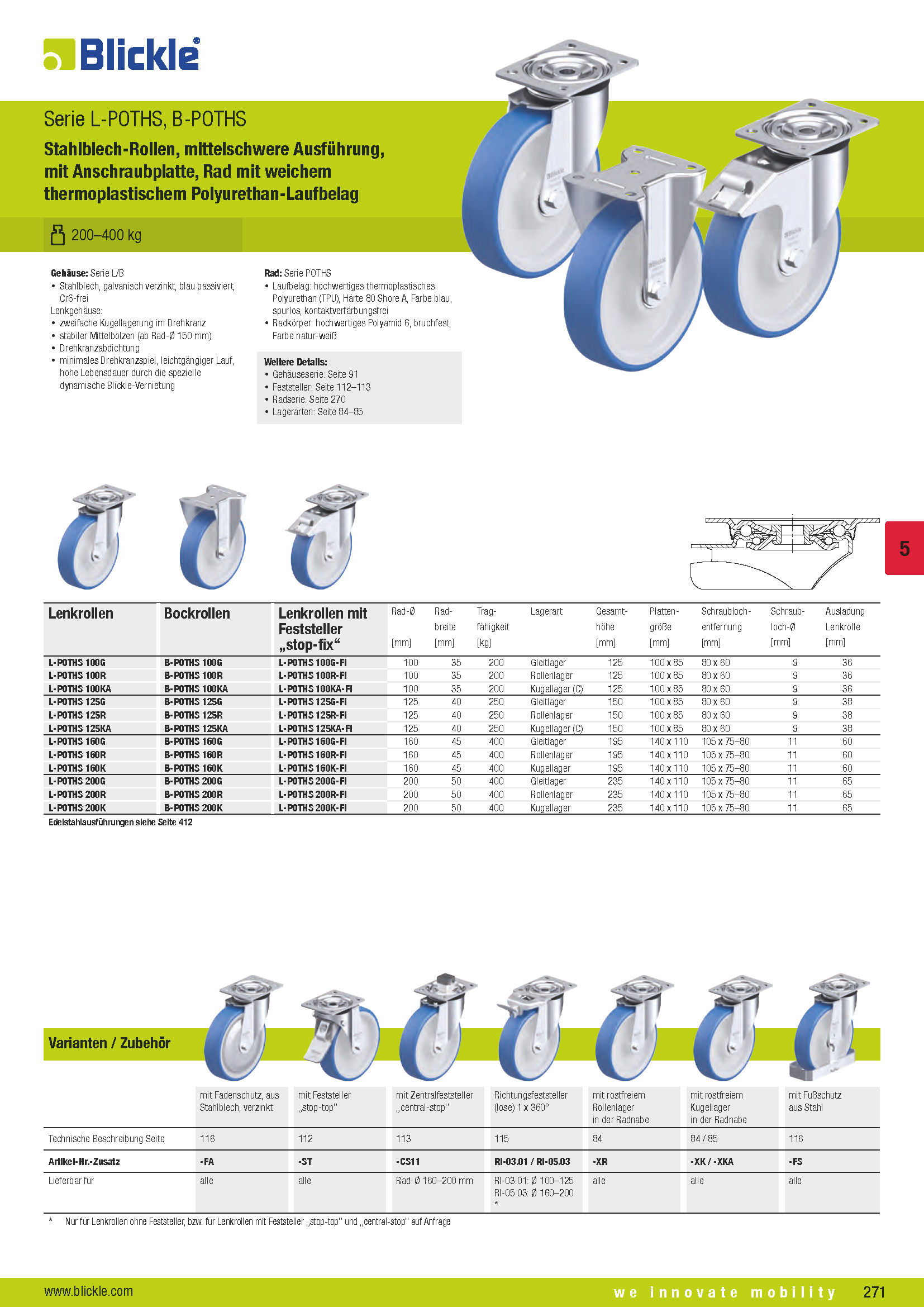 L-POTHS, B-POTHS Stahlblech-Rollen, mittelschwere Ausführung, mit Anschraubplatte, Rad mit weichem thermoplastischem Polyurethan-Laufbelag
