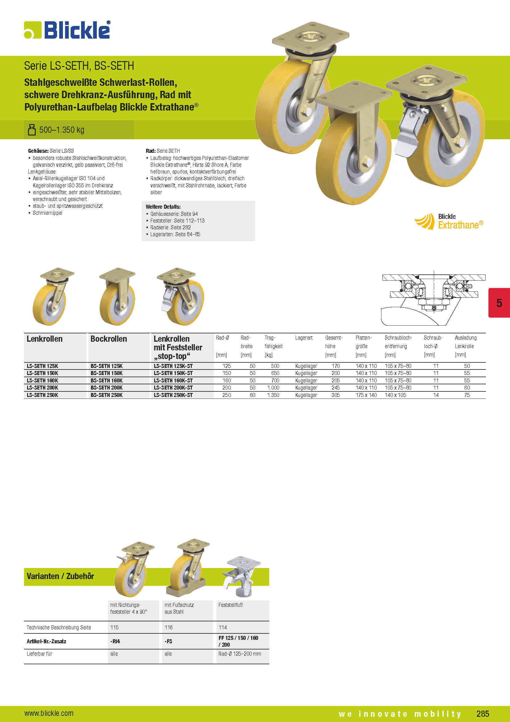 LS-SETH, BS-SETH Welded steel heavy-duty castors, heavy-duty swivel head, wheel with Blickle Extrathane® polyurethane tread