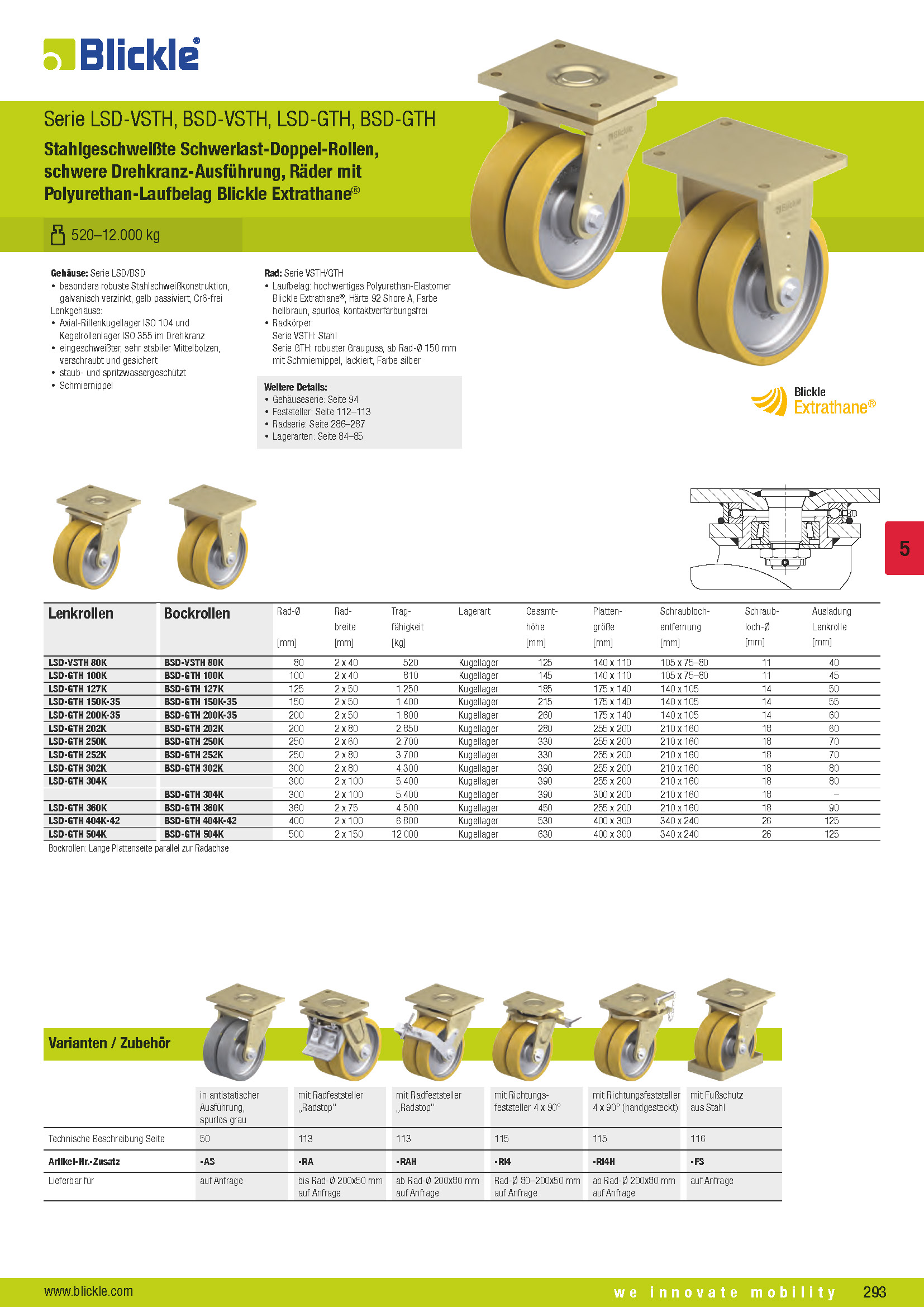 LSD-VSTH, BSD-VSTH, LSD-GTH, BSD-GTH Stahlgeschweißte Schwerlast-Doppel-Rollen, schwere Drehkranz-Ausführung, Räder mit Polyurethan-Laufbelag Blickle Extrathane®