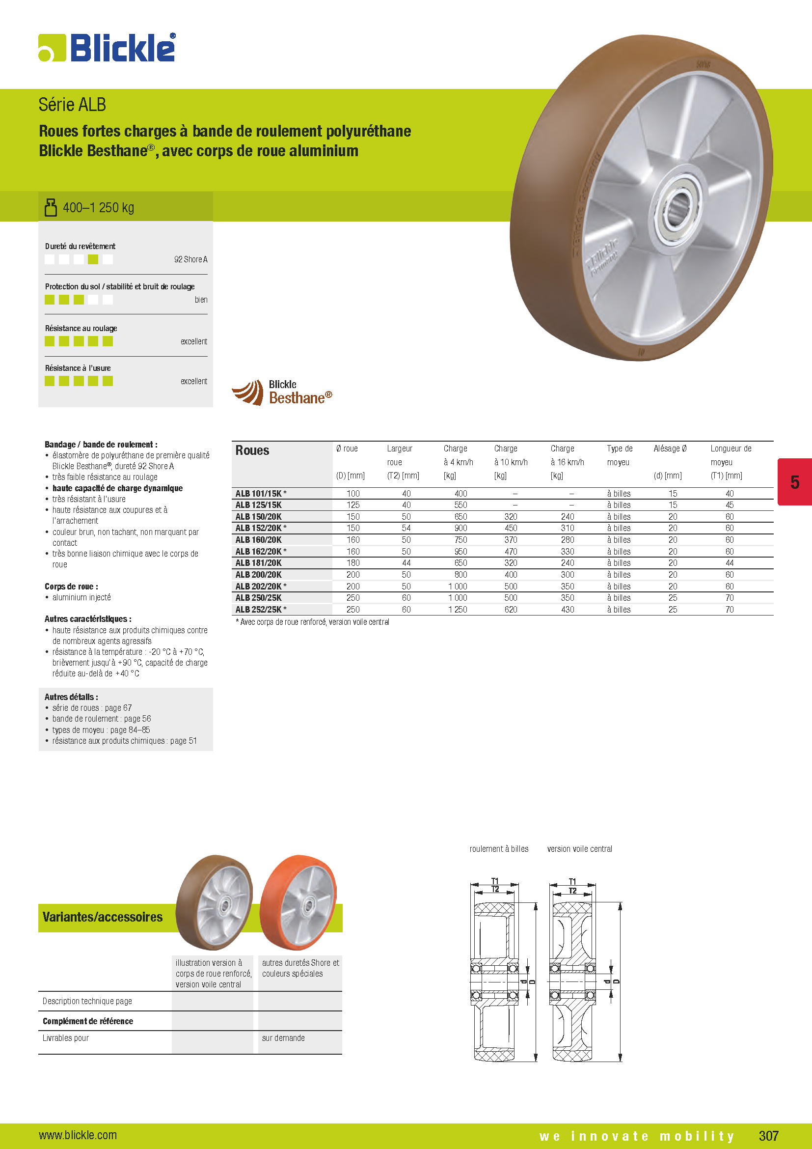 ALB Roues fortes charges à bande de roulement polyuréthane Blickle Besthane®, avec corps de roue aluminium