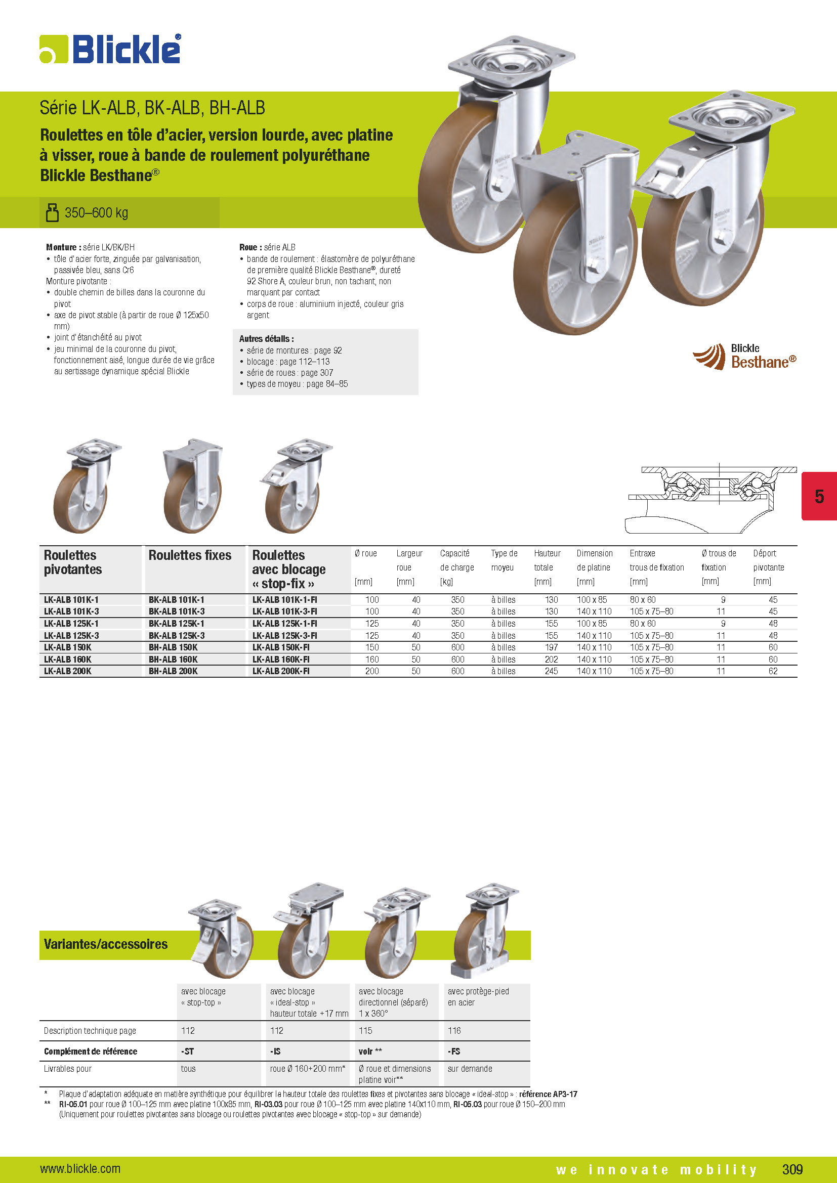 LK-ALB, BK-ALB, BH-ALB Roulettes en tôle d’acier, version lourde, avec platine à visser, roue à bande de roulement polyuréthane Blickle Besthane®