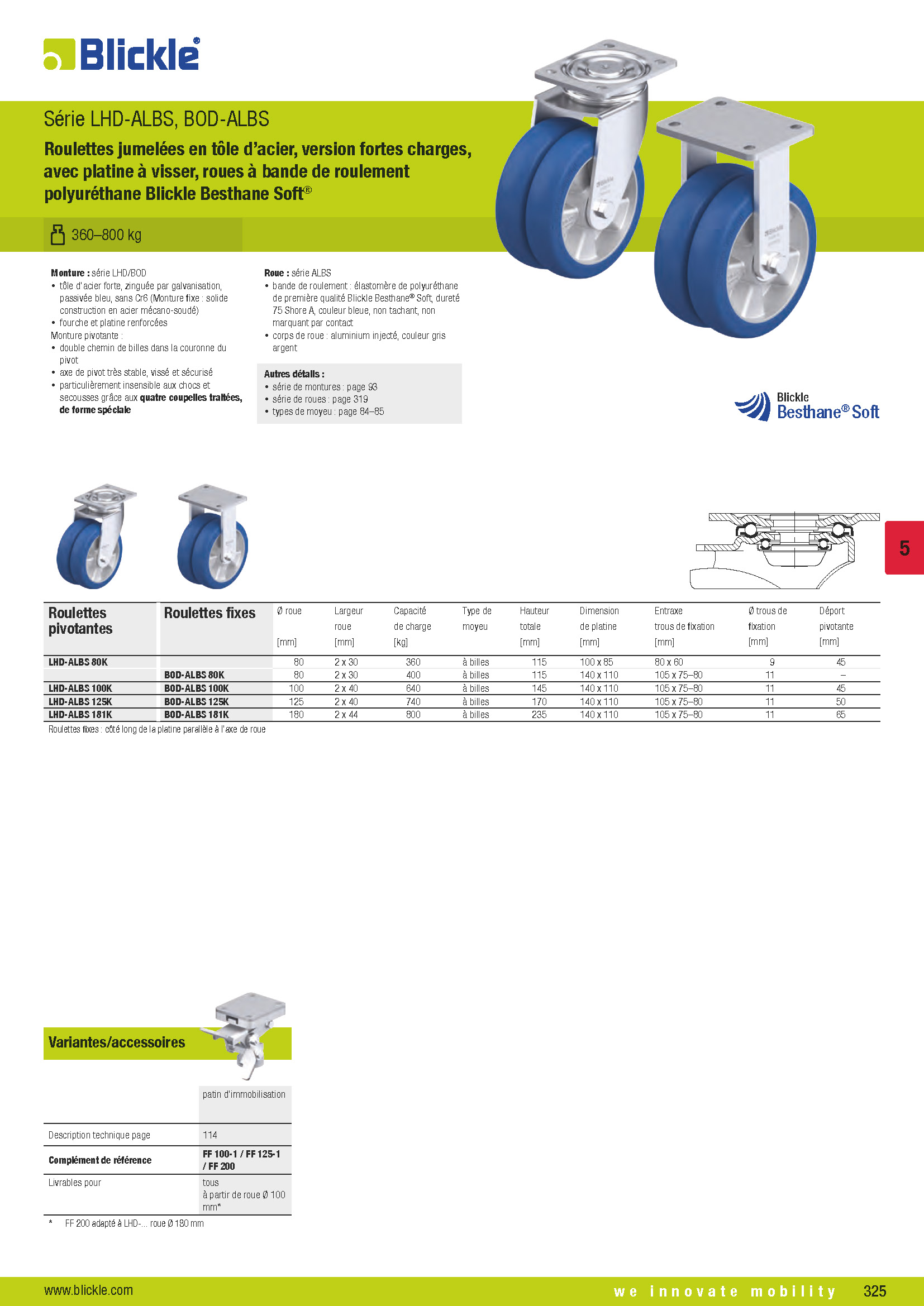 LHD-ALBS, BOD-ALBS Roulettes jumelées en tôle d’acier, version fortes charges, avec platine à visser, roues à bande de roulement polyuréthane Blickle Besthane Soft®