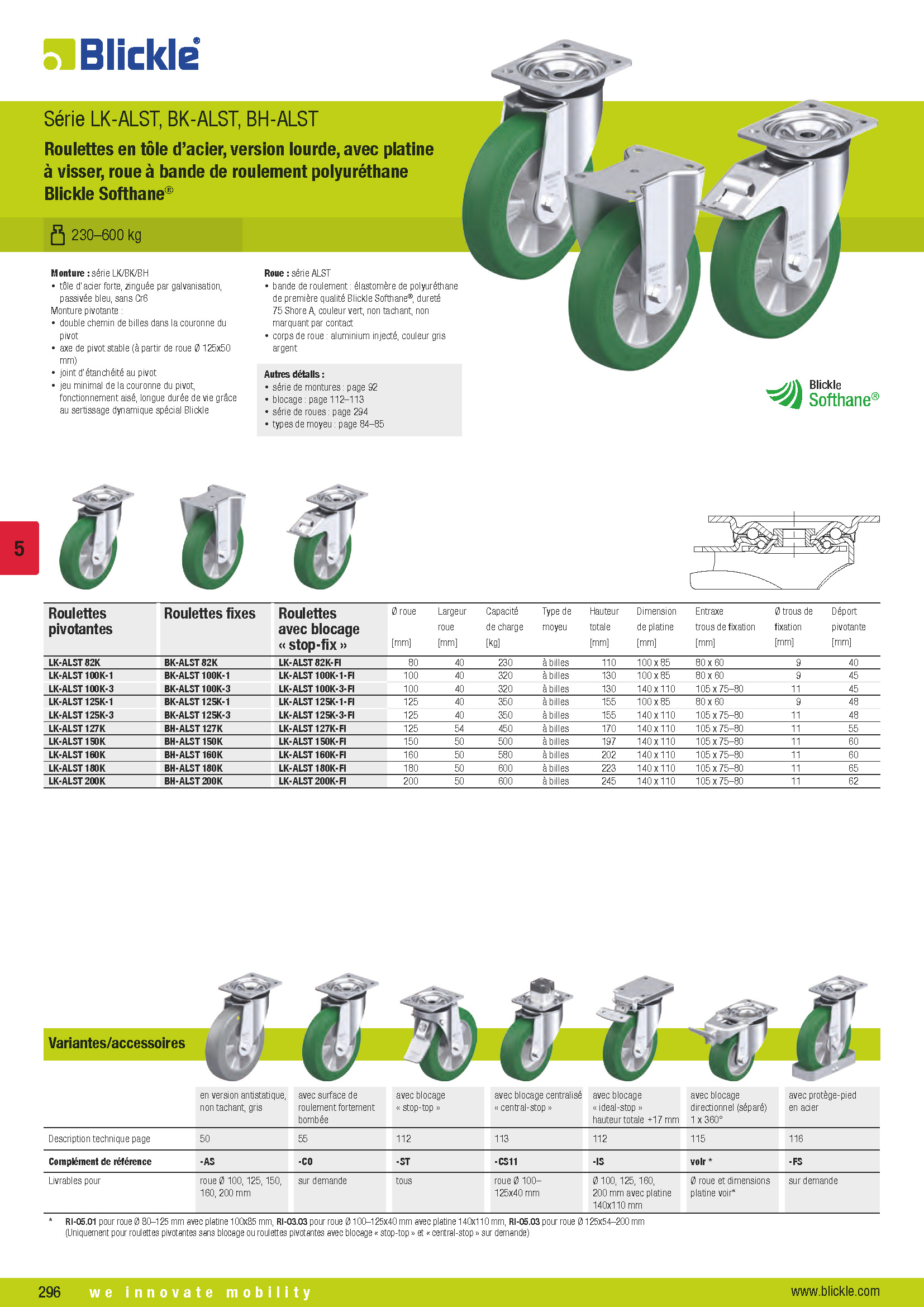 LK-ALST, BK-ALST, BH-ALST Roulettes en tôle d’acier, version lourde, avec platine à visser, roue à bande de roulement polyuréthane Blickle Softhane®