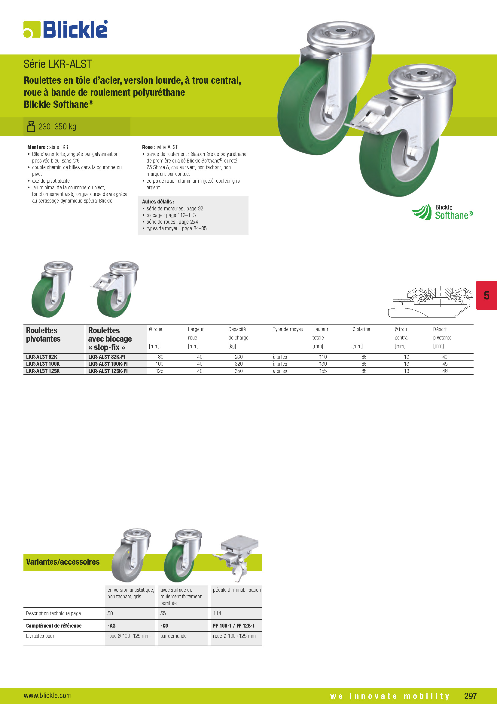 LKR-ALST Roulettes en tôle d’acier, version lourde, à trou central, roue à bande de roulement polyuréthane Blickle Softhane®