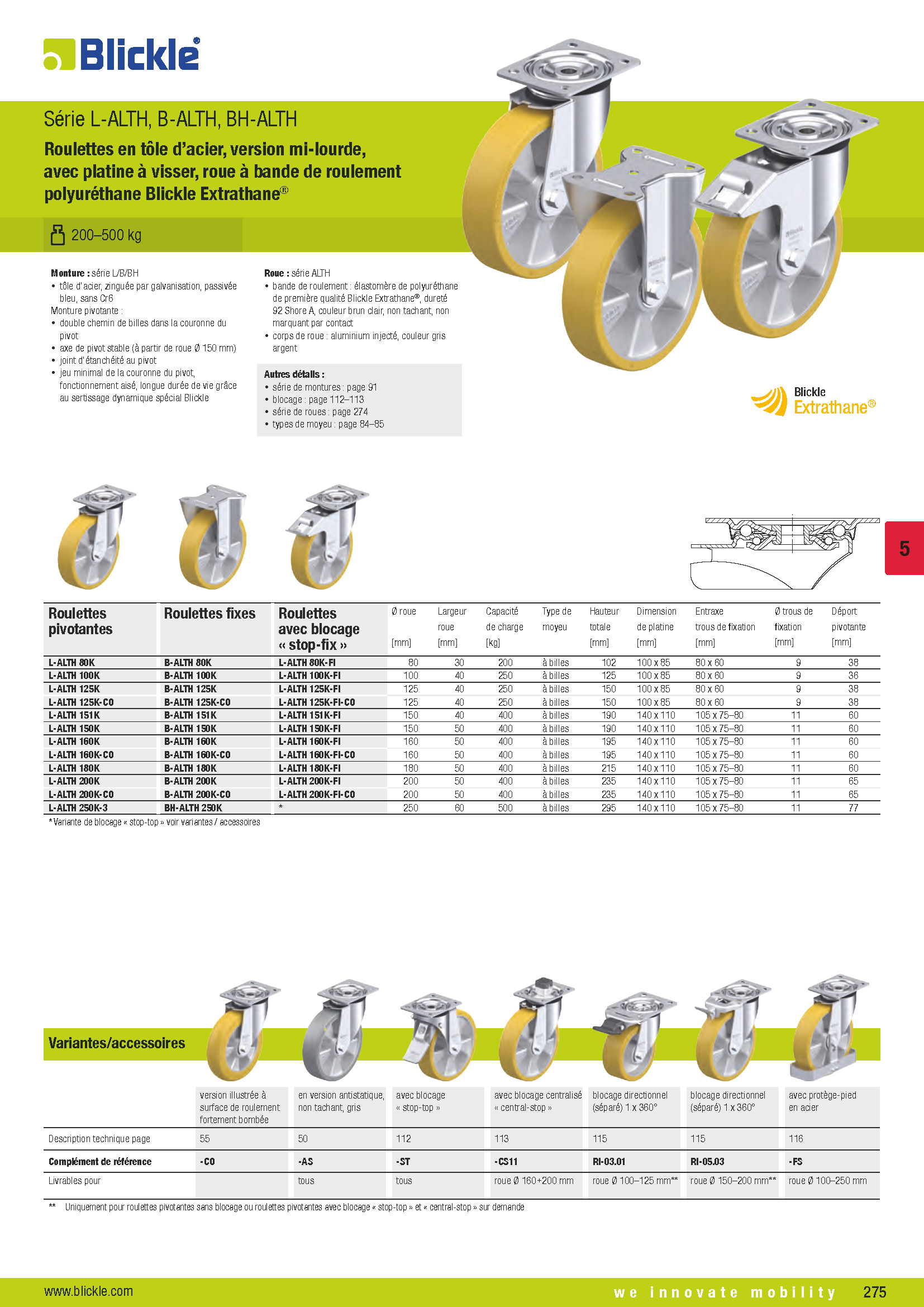 L-ALTH, B-ALTH, BH-ALTH Roulettes en tôle d’acier, version mi-lourde, avec platine à visser, roue à bande de roulement polyuréthane Blickle Extrathane