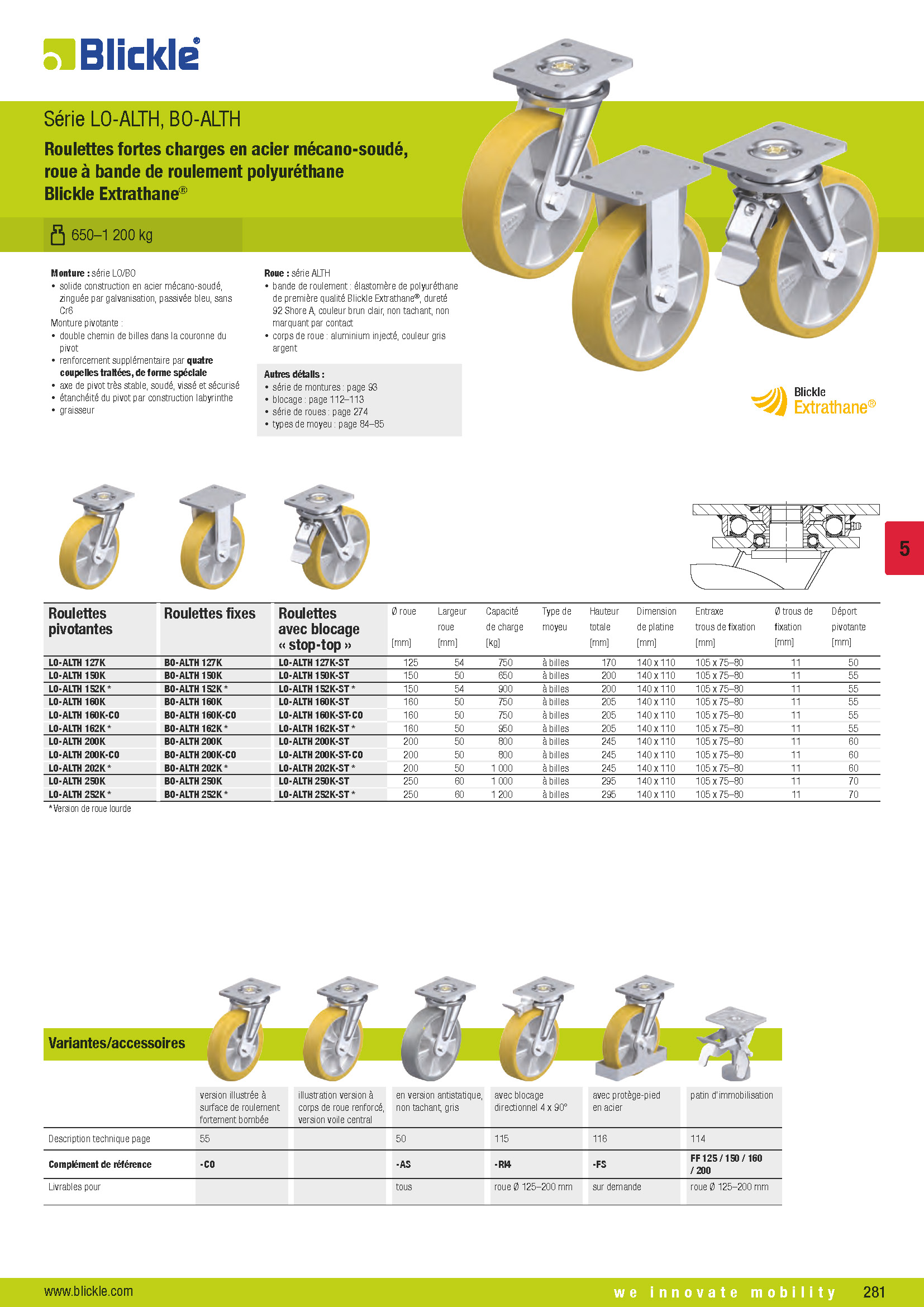 LO-ALTH, BO-ALTH Roulettes fortes charges en acier mécano-soudé, roue à bande de roulement polyuréthane Blickle Extrathane®