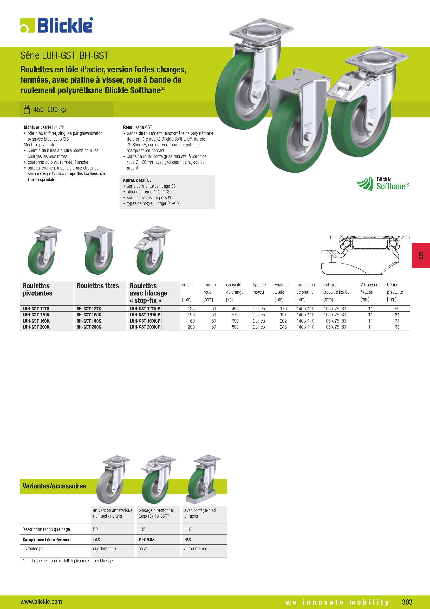 LUH-GST, BH-GST Roulettes en tôle d’acier, version fortes charges, fermées, avec platine à visser, roue à bande de roulement polyuréthane Blickle Softhane®