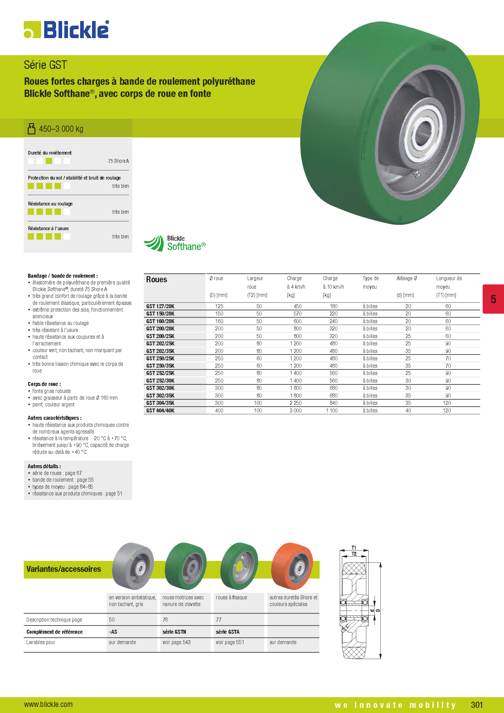 GST Roues fortes charges à bande de roulement polyuréthane Blickle Softhane®, avec corps de roue en fonte