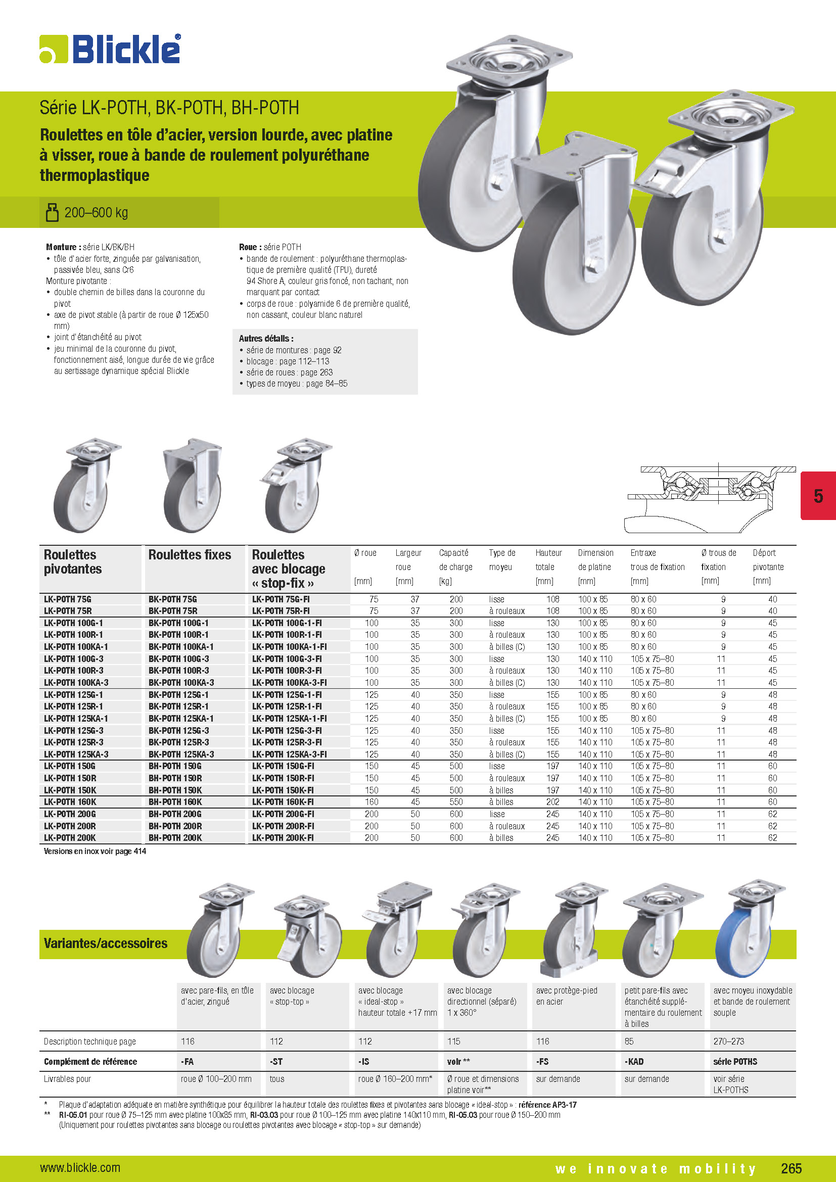 LK-POTH, BK-POTH, BH-POTH Roulettes en tôle d’acier, version lourde, avec platine à visser, roue à bande de roulement polyuréthane thermoplastique