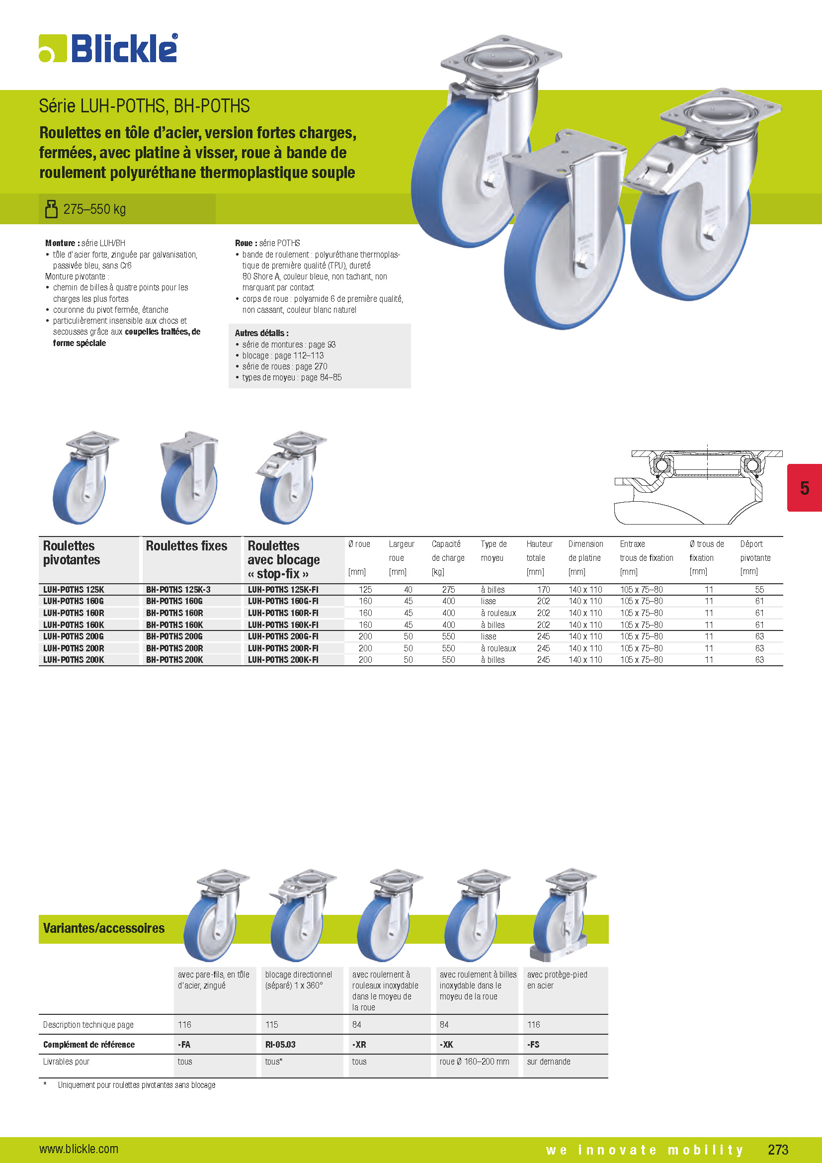 LUH-POTHS, BH-POTHS Roulettes en tôle d’acier, version fortes charges, fermées, avec platine à visser, roue à bande de roulement polyuréthane thermoplastique souple