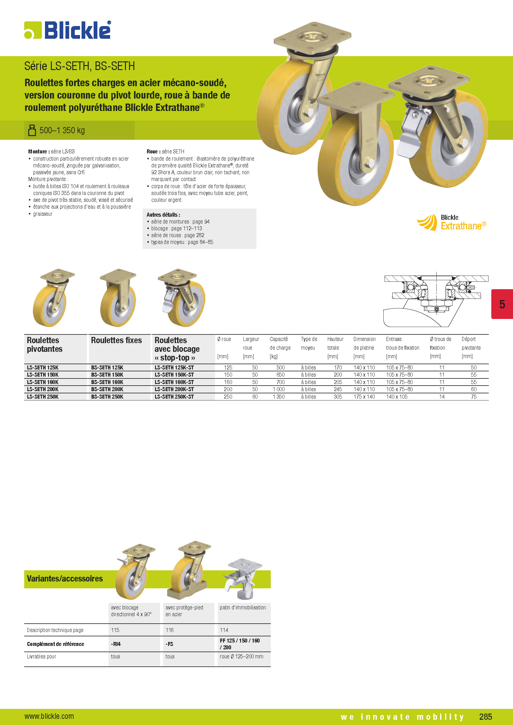 LS-SETH, BS-SETH Roulettes fortes charges en acier mécano-soudé, version couronne du pivot lourde, roue à bande de roulement polyuréthane Blickle Extrathane®