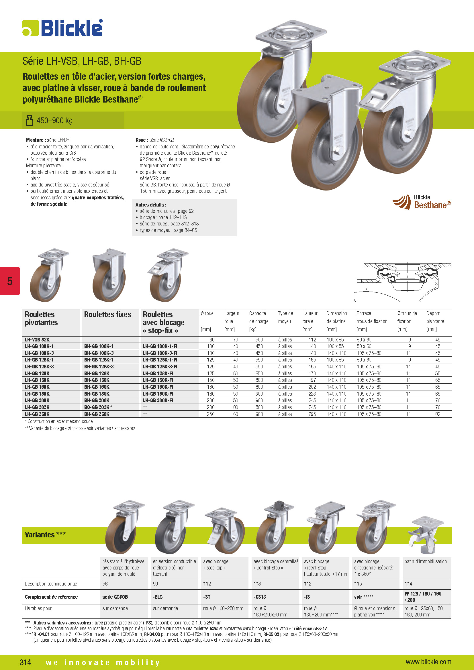 LH-VSB, LH-GB, BH-GB Roulettes en tôle d’acier, version fortes charges, avec platine à visser, roue à bande de roulement polyuréthane Blickle Besthane®