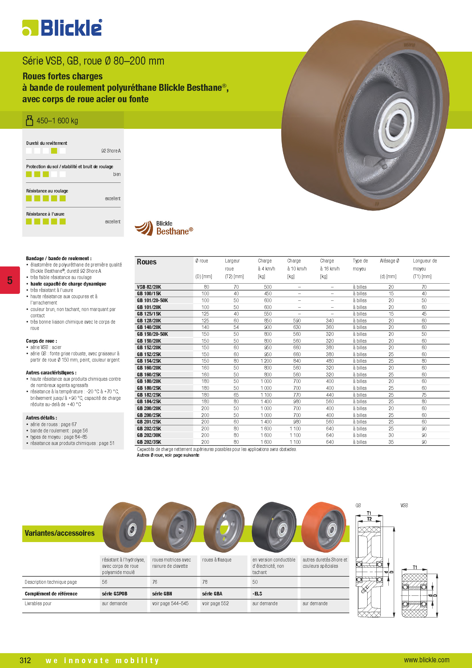 VSB, GB, roue Ø 80–200 mm Roues fortes charges à bande de roulement polyuréthane Blickle Besthane®, avec corps de roue acier ou fonte