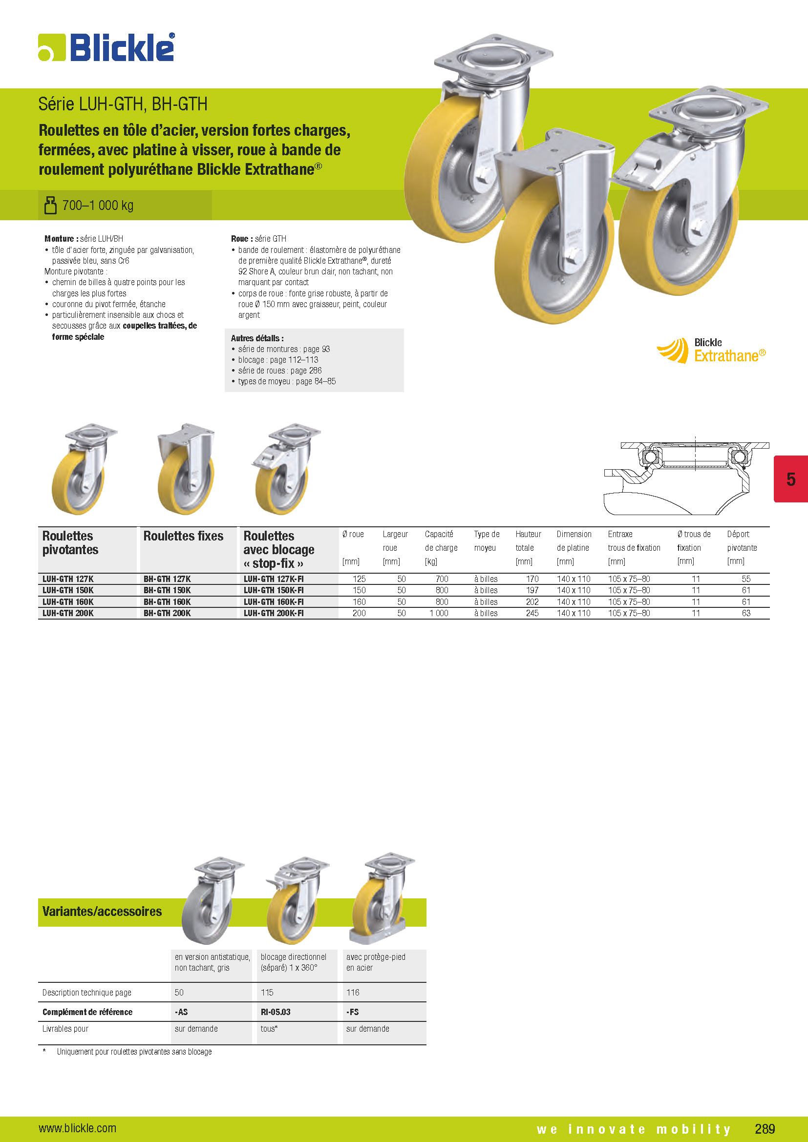 LUH-GTH, BH-GTH Roulettes en tôle d’acier, version fortes charges, fermées, avec platine à visser, roue à bande de roulement polyuréthane Blickle Extrathane®