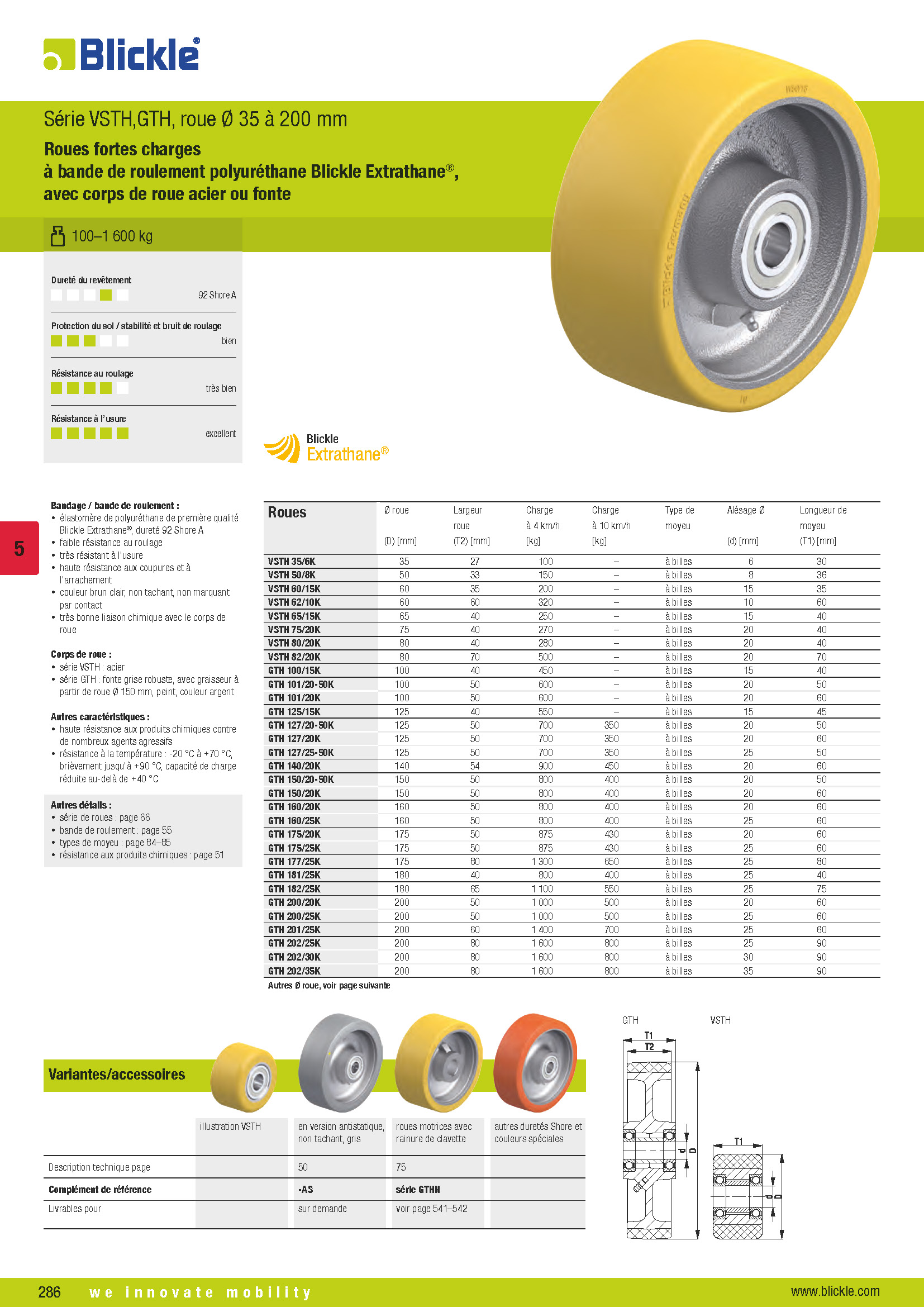 VSTH,GTH, roue Ø 35 à 200 mm Roues fortes charges à bande de roulement polyuréthane Blickle Extrathane®, avec corps de roue acier ou fonte