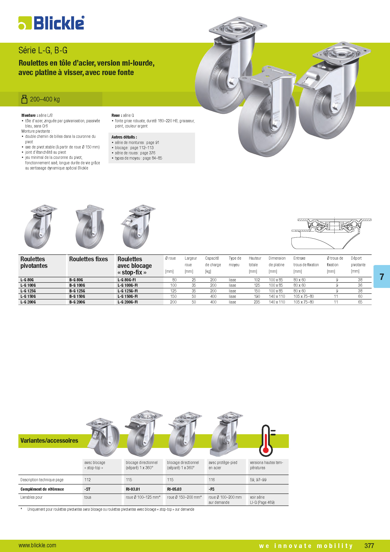L-G, B-G Roulettes en tôle d’acier, version mi-lourde, avec platine à visser, avec roue fonte