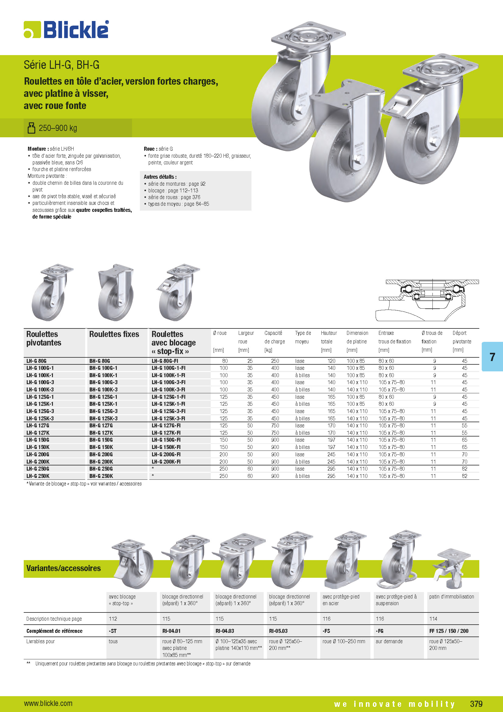 LH-G, BH-G Roulettes en tôle d’acier, version fortes charges, avec platine à visser, avec roue fonte