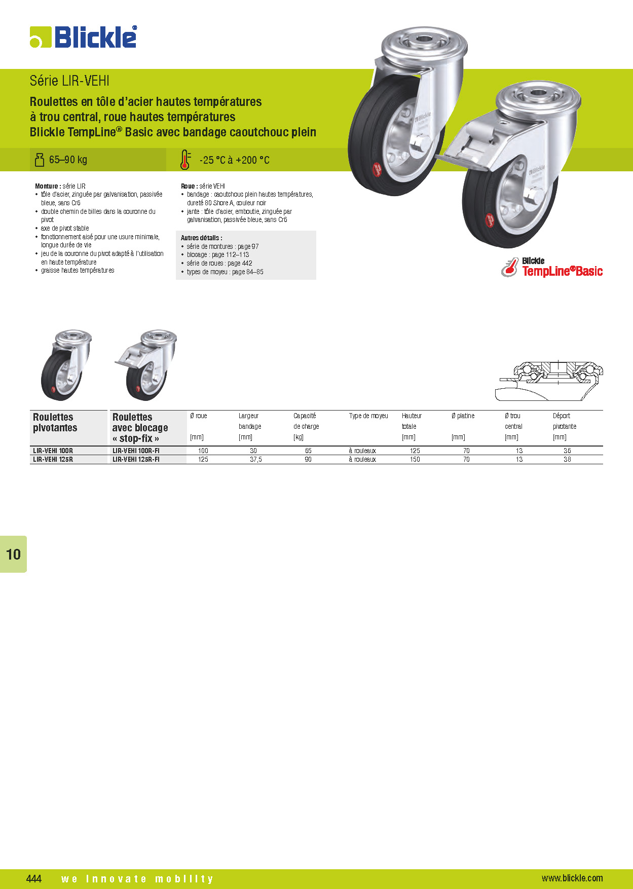 LIR-VEHI Roulettes en tôle d’acier hautes températures à trou central, roue hautes températures Blickle TempLine® Basic avec bandage caoutchouc plein