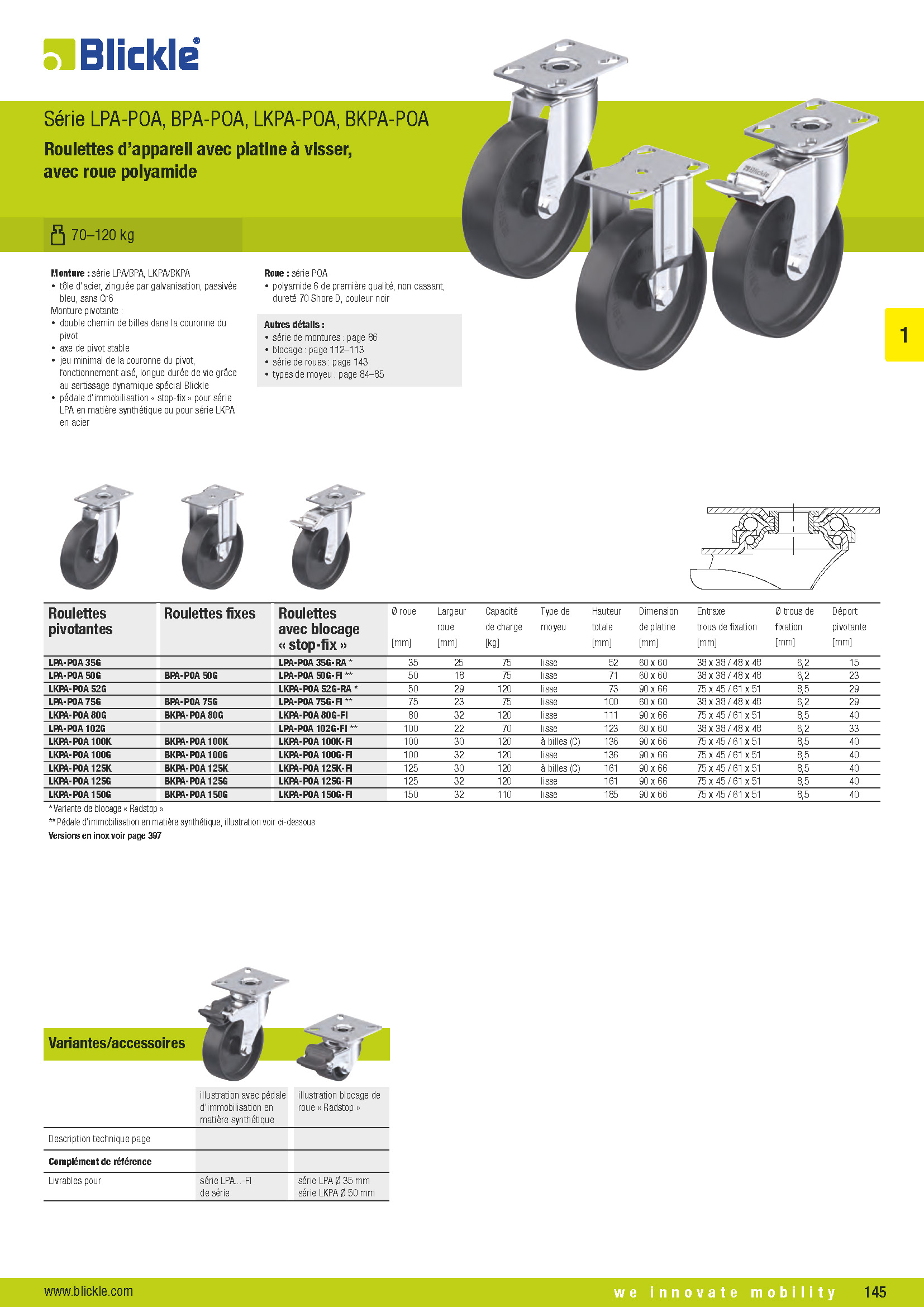 LPA-POA, BPA-POA, LKPA-POA, BKPA-POA Roulettes d’appareil avec platine à visser, avec roue polyamide