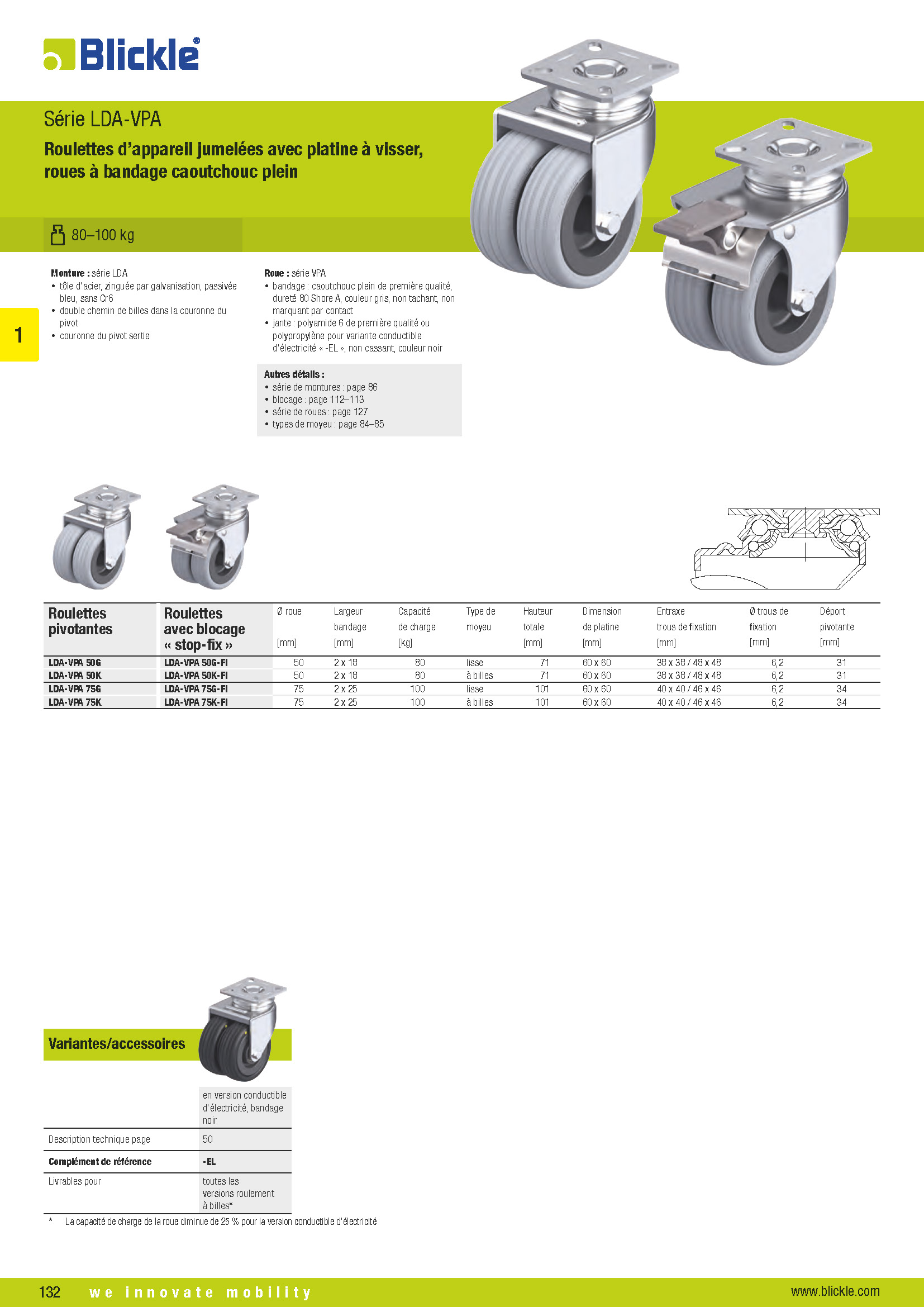 LDA-VPA Roulettes d’appareil jumelées avec platine à visser, roues à bandage caoutchouc plein