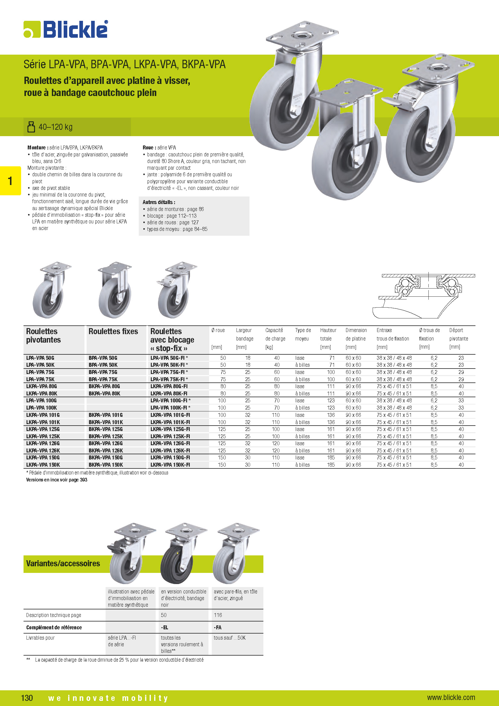 LPA-VPA, BPA-VPA, LKPA-VPA, BKPA-VPA Roulettes d’appareil avec platine à visser, roue à bandage caoutchouc plein