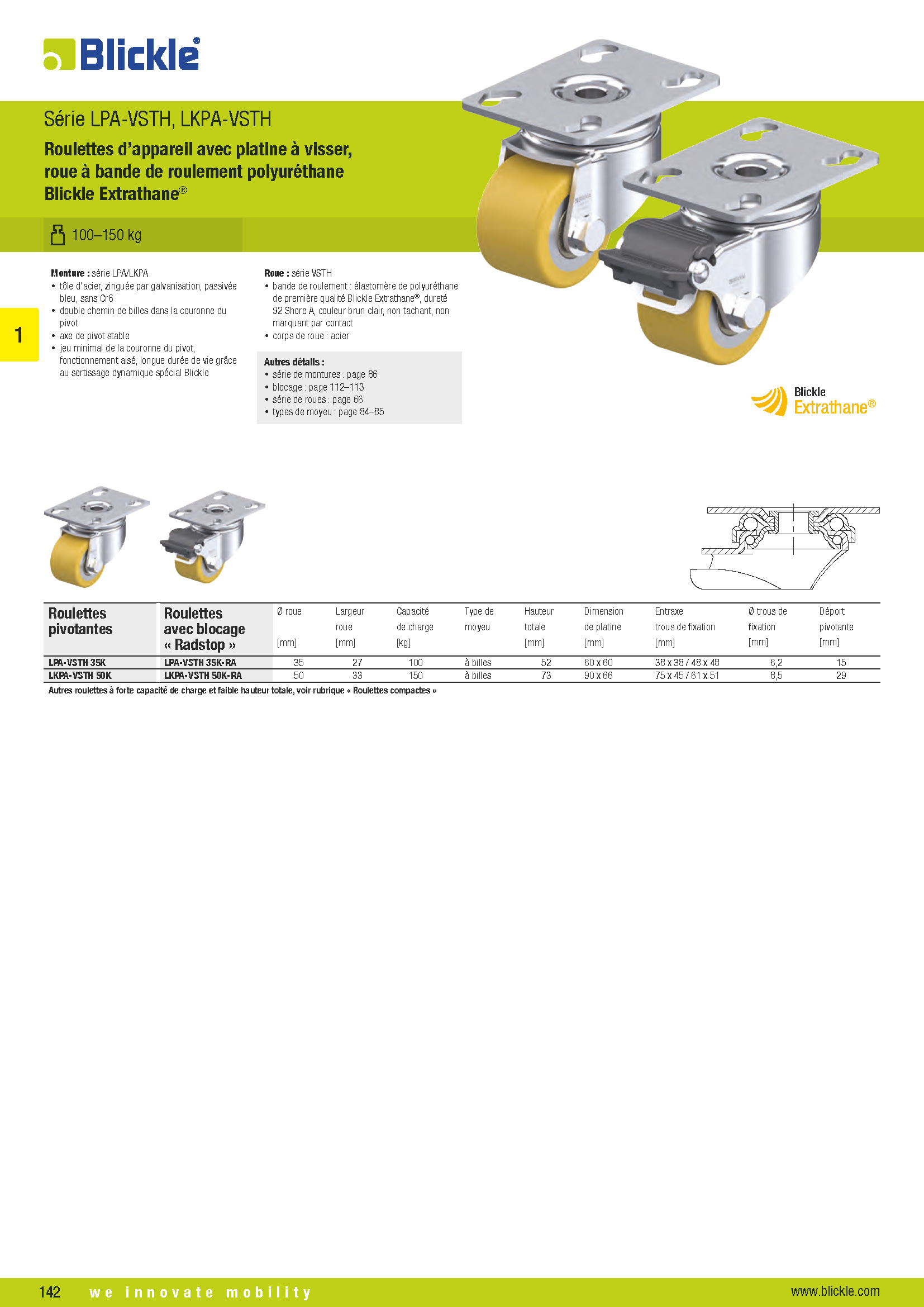 LPA-VSTH, LKPA-VSTH Roulettes d’appareil avec platine à visser, roue à bande de roulement polyuréthane Blickle Extrathane®