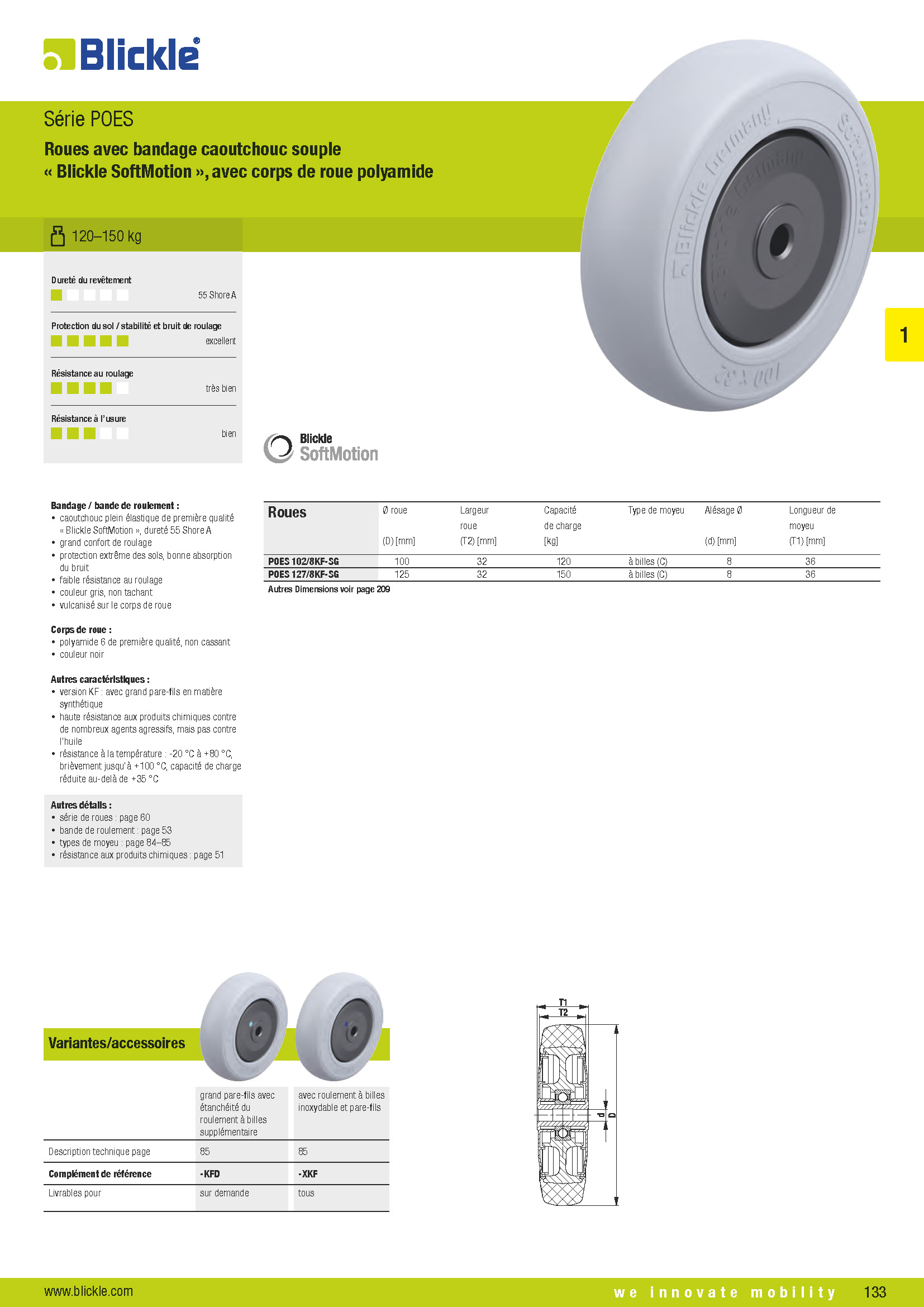 POES Roues avec bandage caoutchouc souple « Blickle SoftMotion », avec corps de roue polyamide
