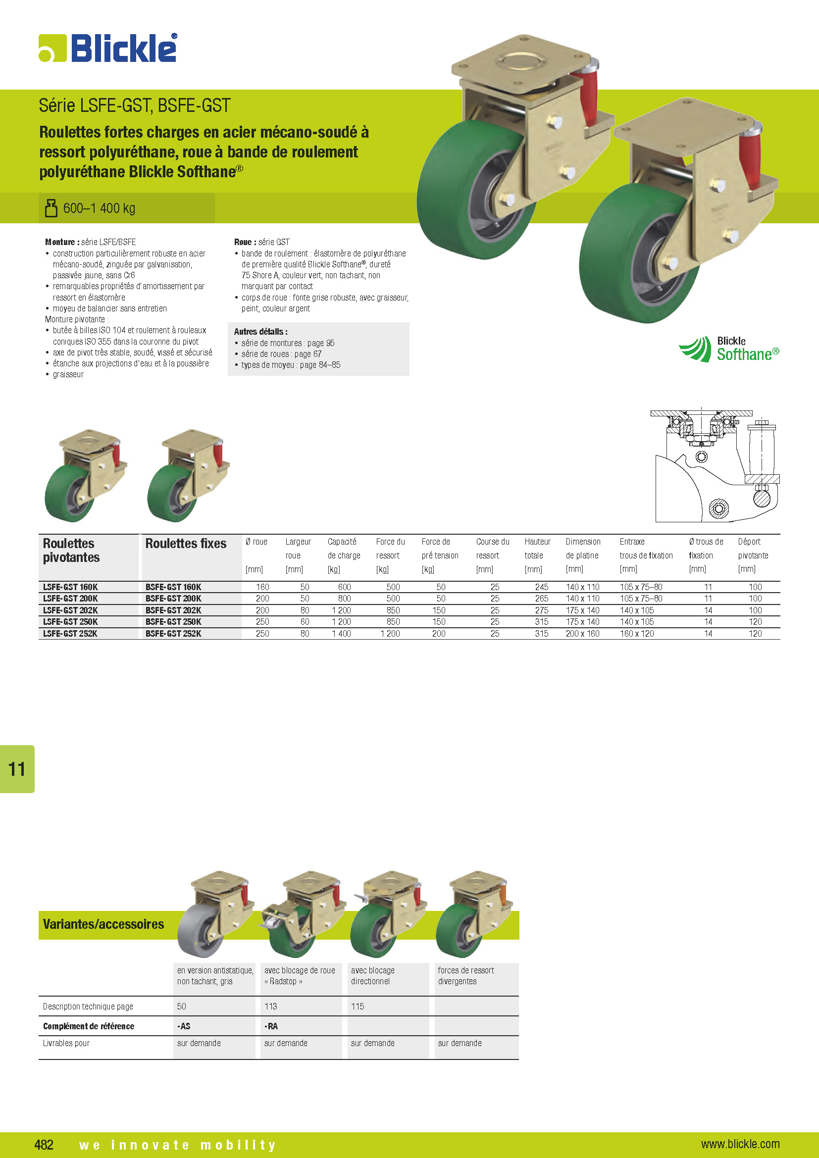 LSFE-GST, BSFE-GST Roulettes fortes charges en acier mécano-soudé à ressort polyuréthane, roue à bande de roulement polyuréthane Blickle Softhane®