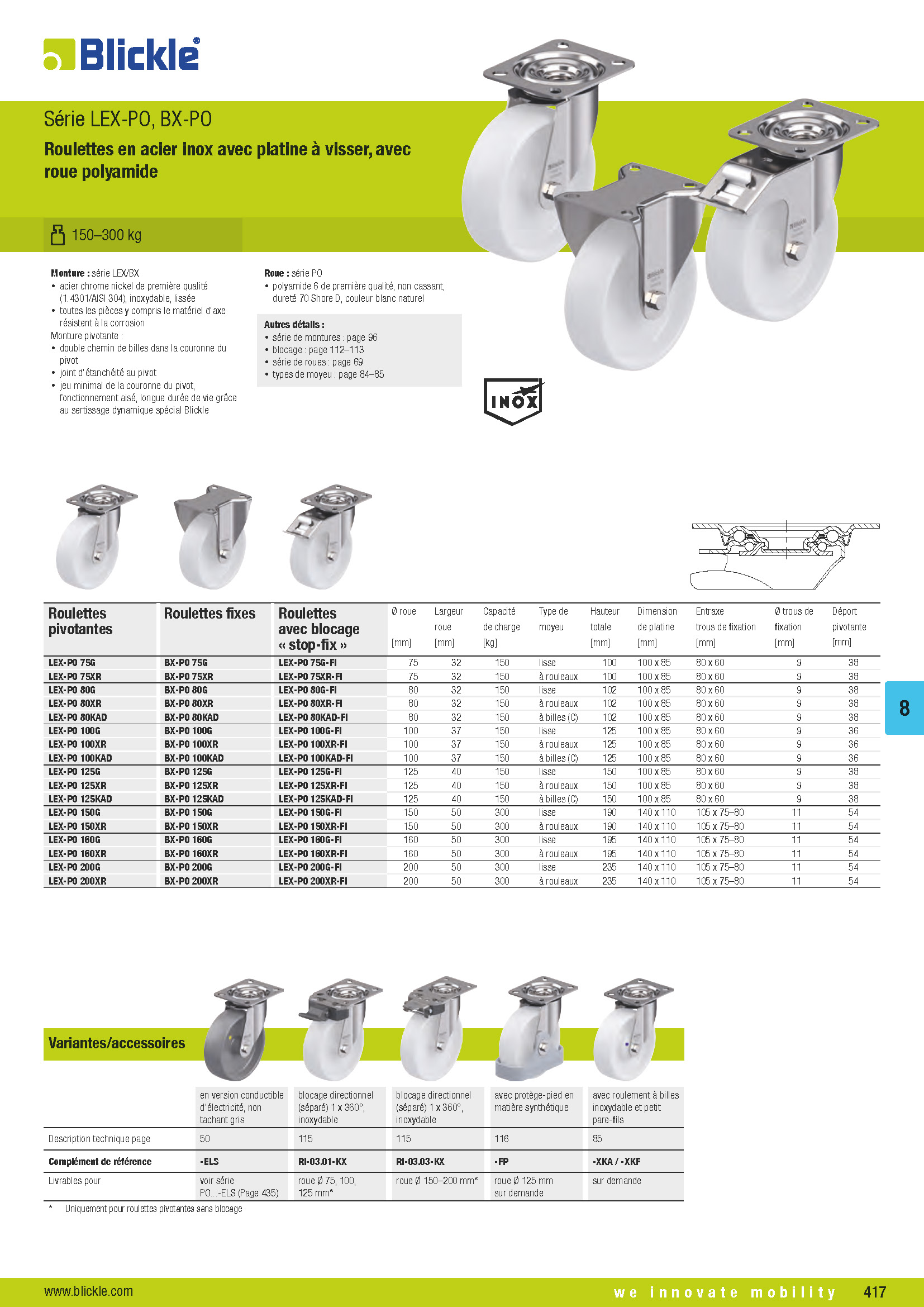 LEX-PO, BX-PO Roulettes en acier inox avec platine à visser, avec roue polyamide