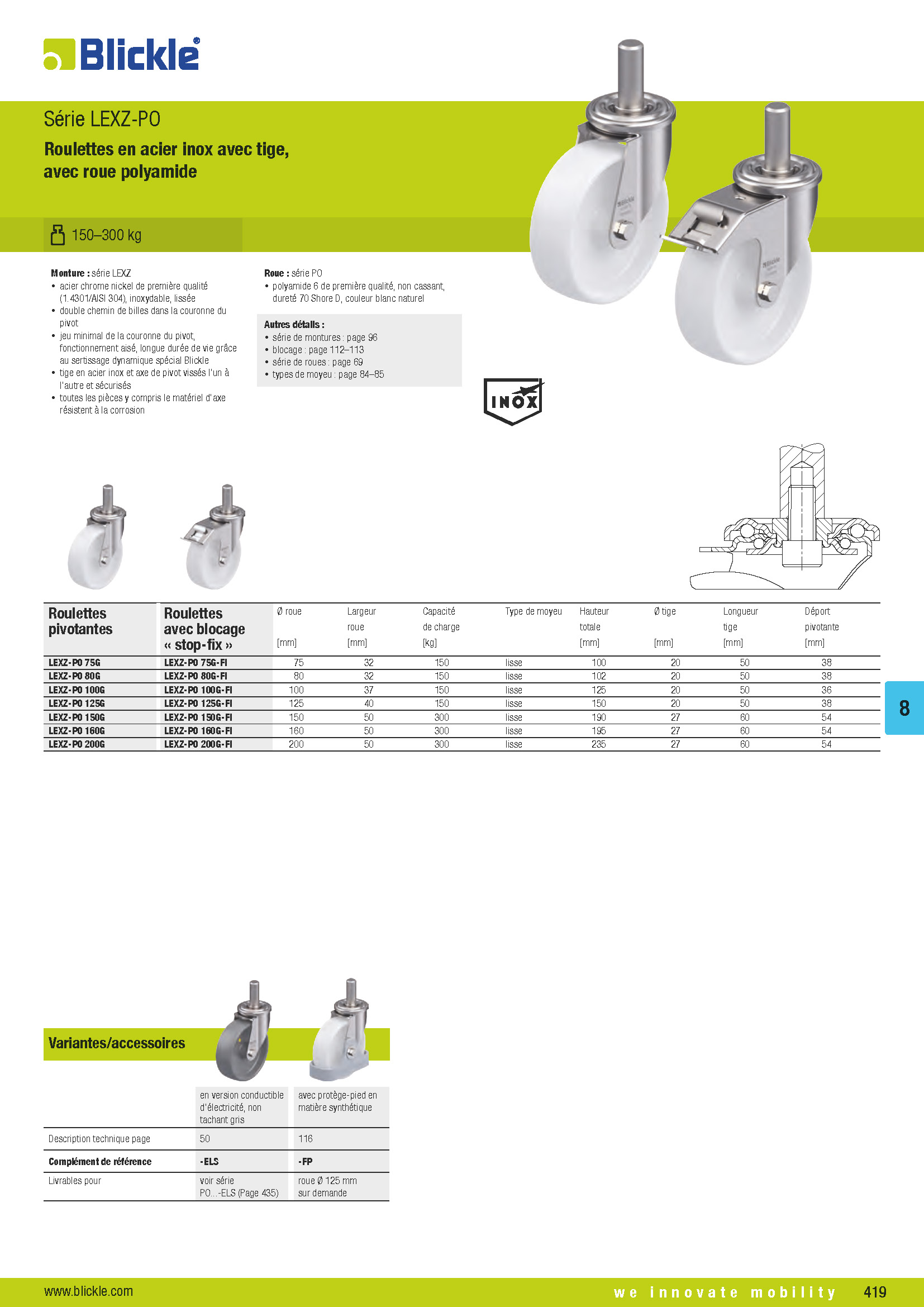 LEXZ-PO Roulettes en acier inox avec tige, avec roue polyamide